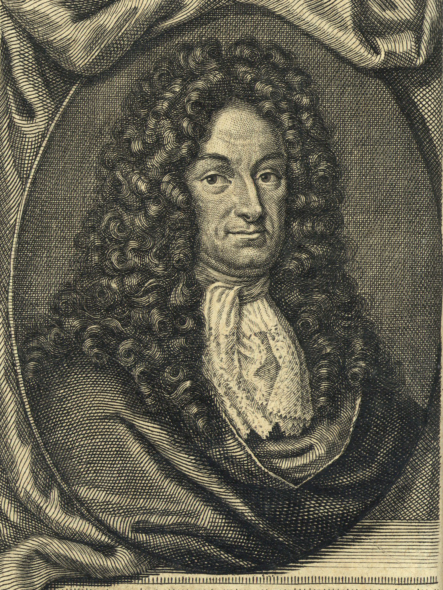 Porträt von Leibniz, Gottfried Wilhelm  (Neuer Bücher-Saal der gelehrten Welt., 1710, 1. Oeffn., ungez. Bl. am Anf. d. Bandes. [Zuschnitt auf Schmuckrahmen])