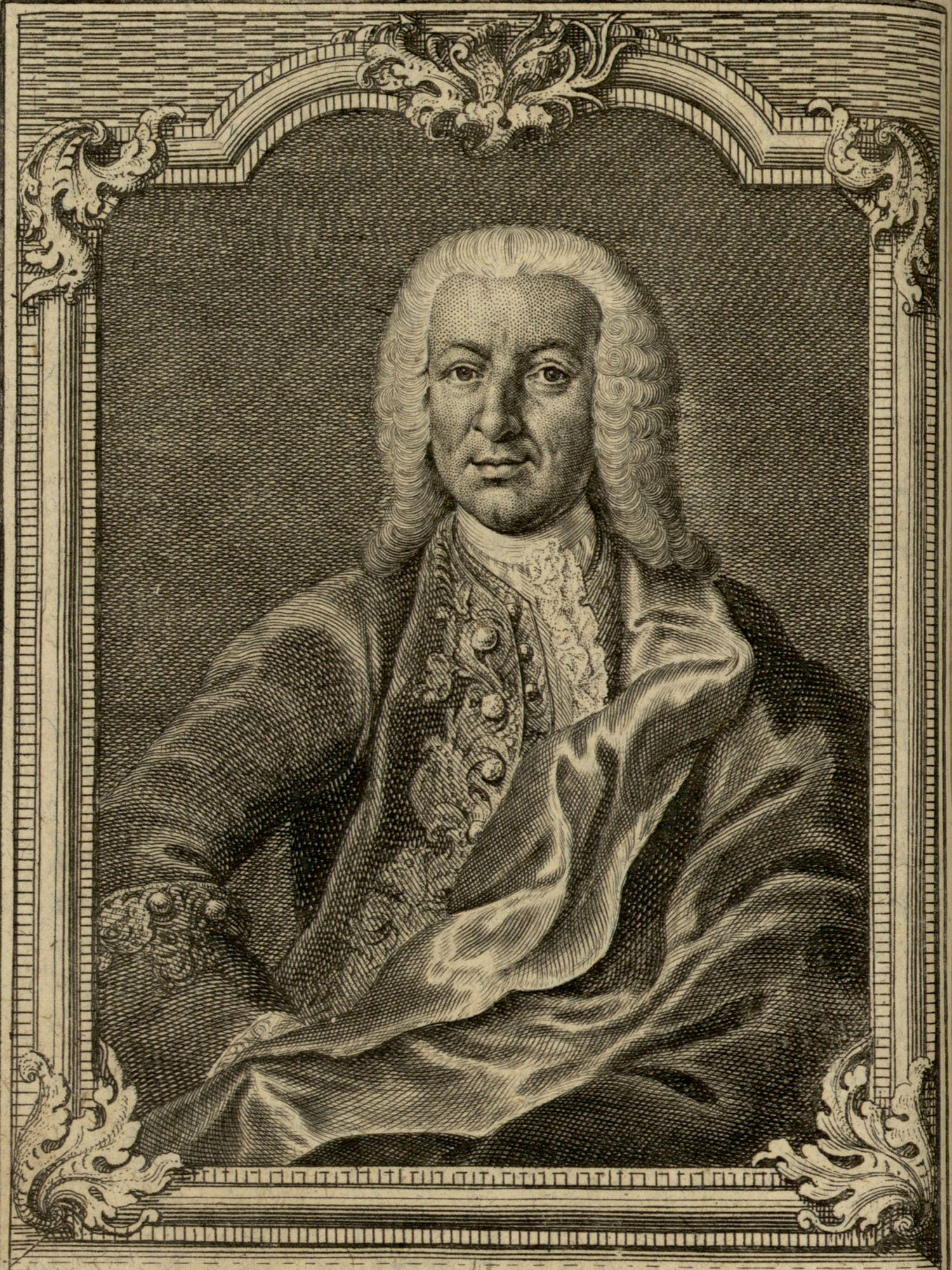 Porträt von Loen, Johann Michael von  (Zuverläßige Nachrichten von dem gegenwärtigen Zustande der Wissenschaften., 1752, 147. T., ungez. Bl. vor S. 164. [Doppelseite])