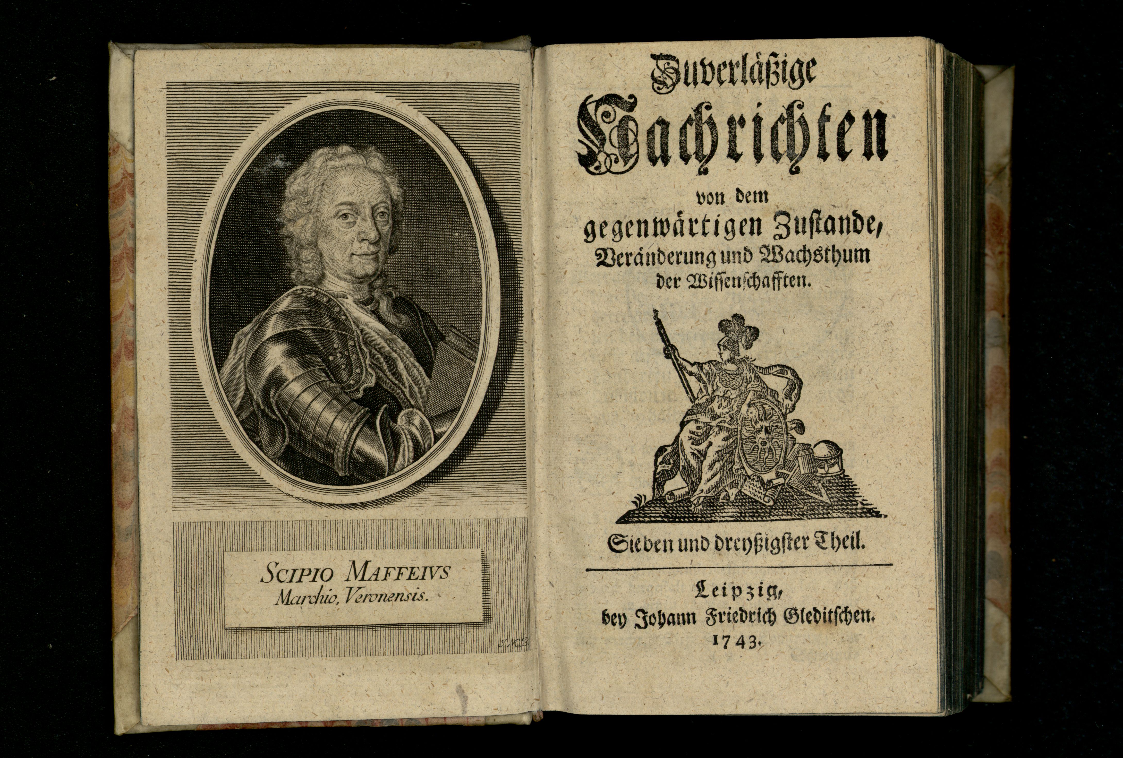 Porträt von Maffei, Scipione  (Zuverläßige Nachrichten von dem gegenwärtigen Zustande der Wissenschaften., 1743, 37. T., ungez. Bl. am Anf. d. Bandes. [Doppelseite])