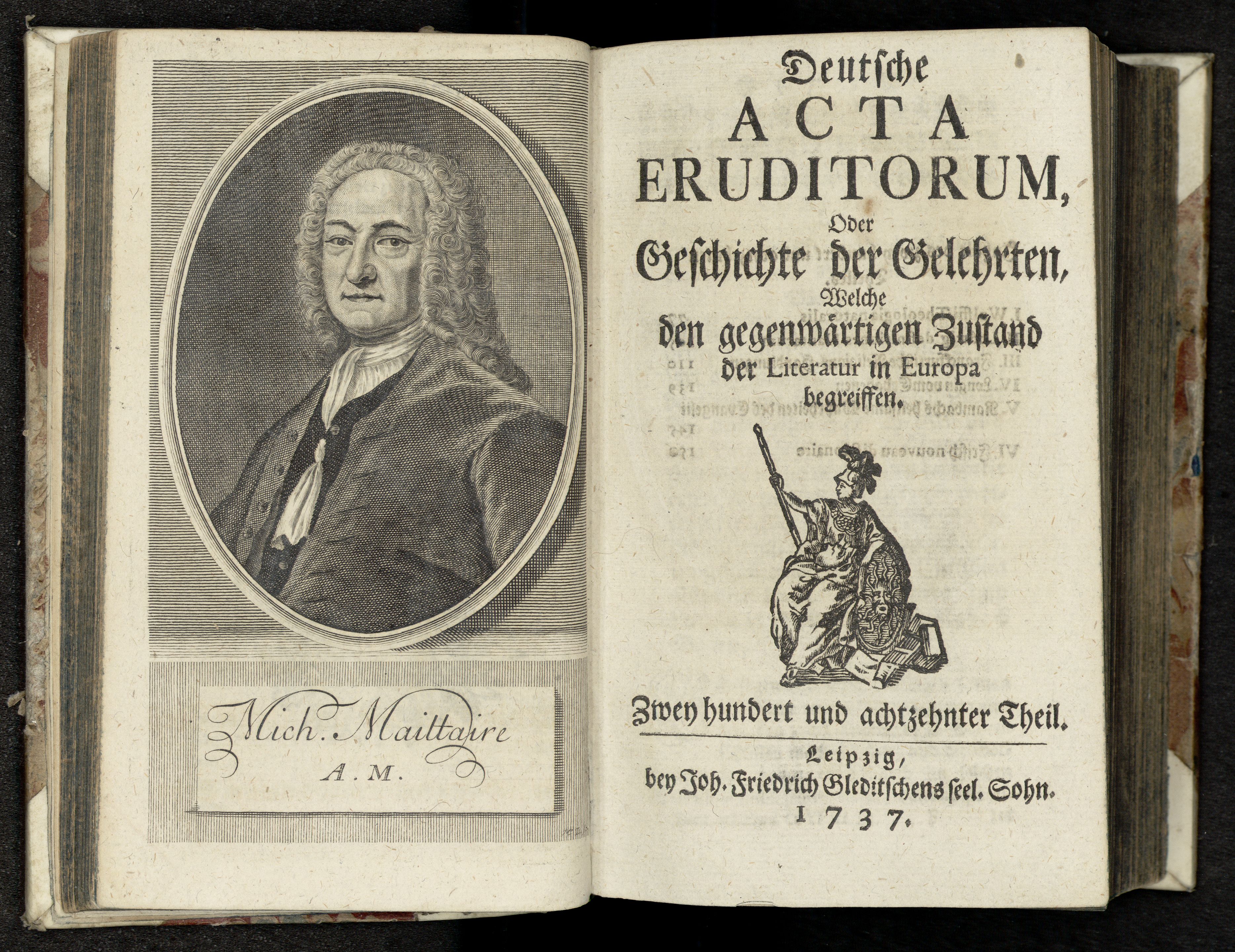 Porträt von Maittaire, Michael  (Deutsche Acta Eruditorum., 1737, 218. T., ungez. Bl. vor S. 77. [Doppelseite])