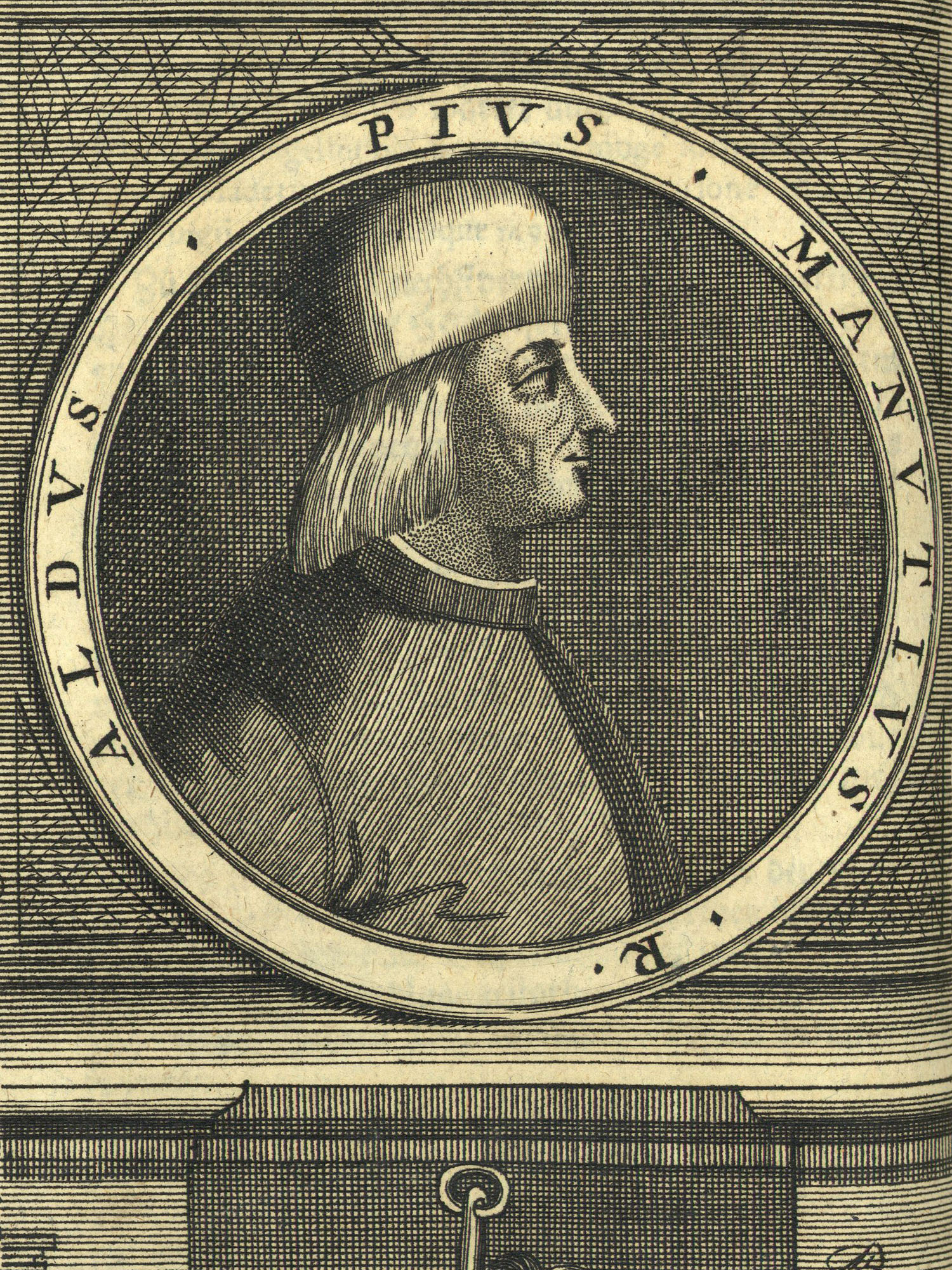 Porträt von Manuzio, Aldo Pio  (Neuer Bücher-Saal der gelehrten Welt., 1712, 16. Oeffn., ungez. Bl. vor S. 225. [Zuschnitt auf Schmuckrahmen])
