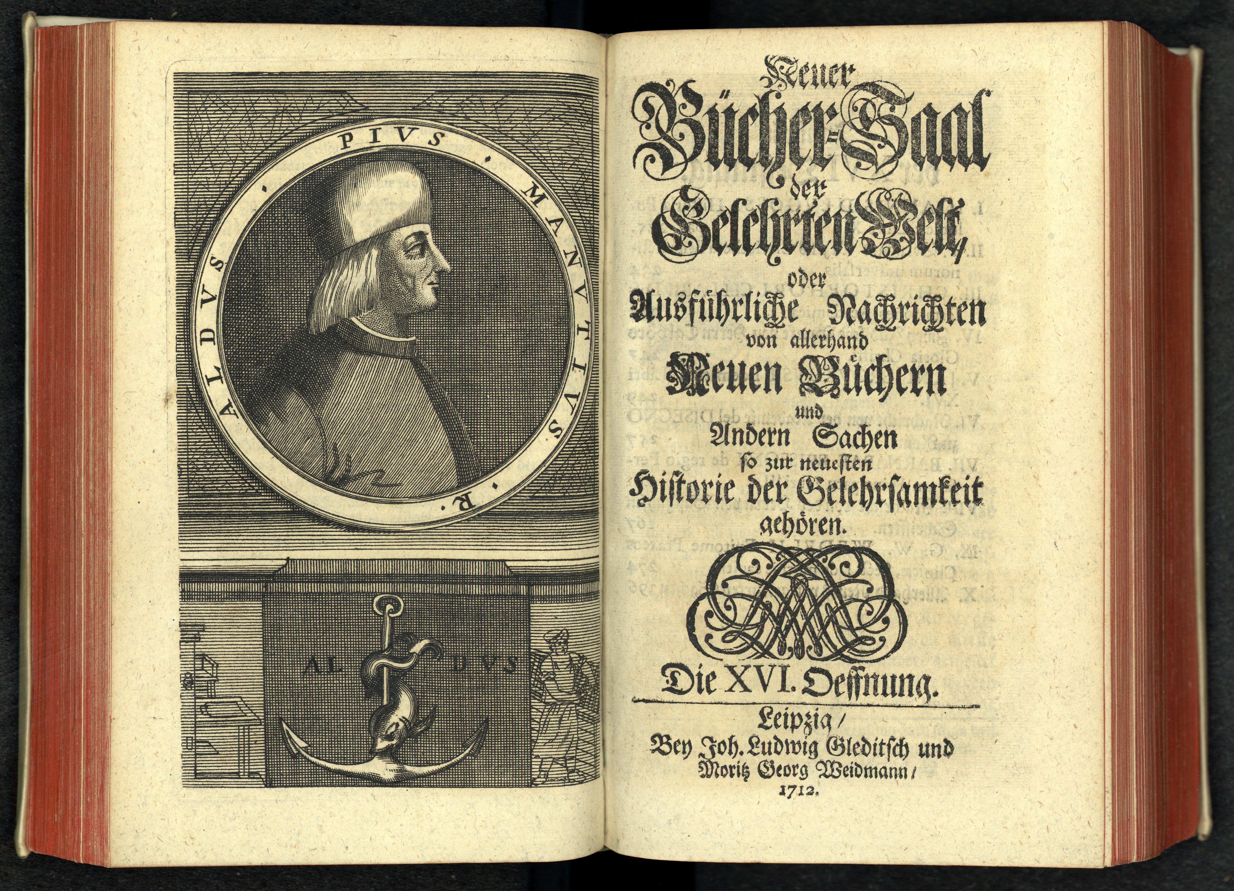 Porträt von Manuzio, Aldo Pio  (Neuer Bücher-Saal der gelehrten Welt., 1712, 16. Oeffn., ungez. Bl. vor S. 225. [Doppelseite])