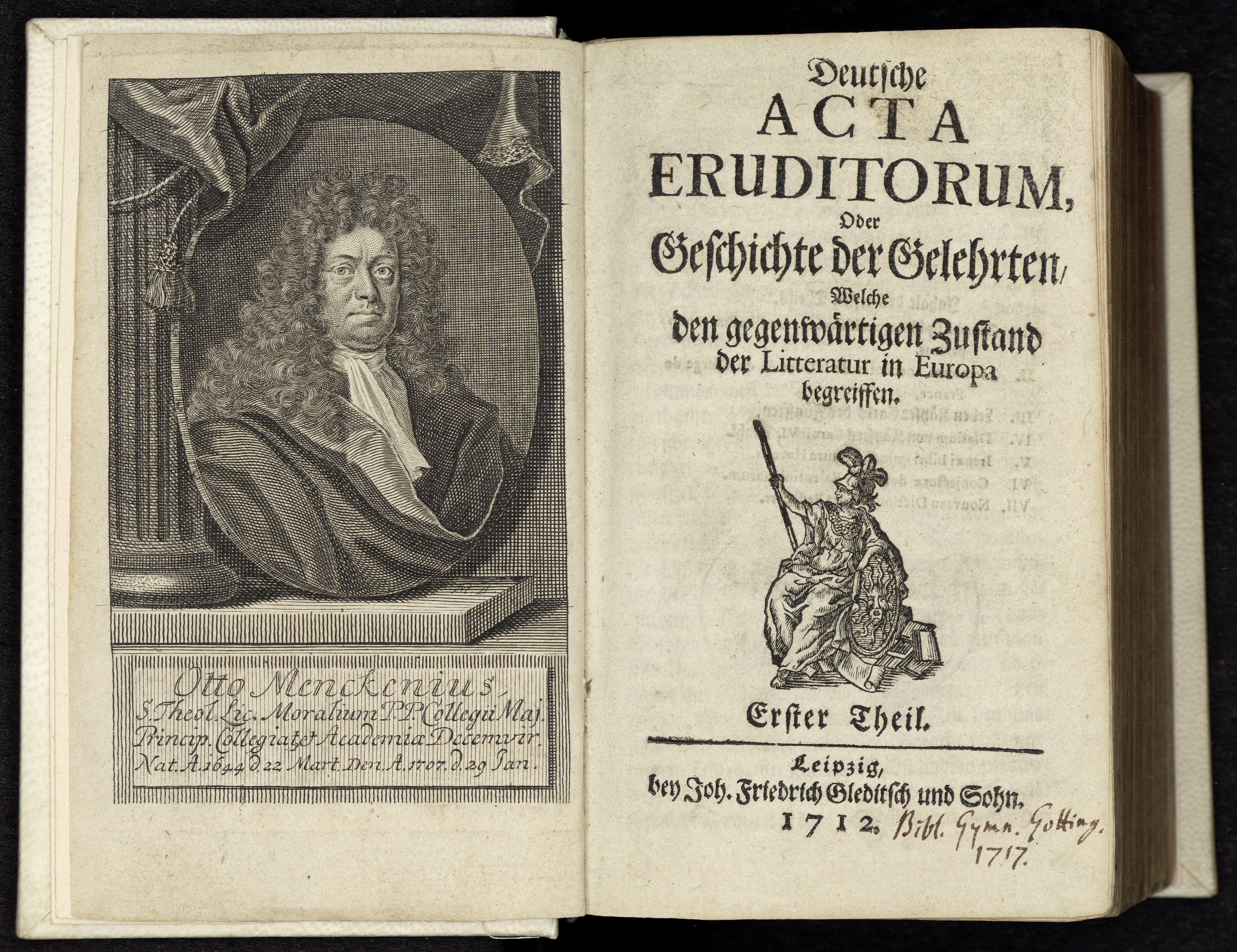 Porträt von Mencke, Otto  (Deutsche Acta Eruditorum., 1712, 1. T., ungez. Bl. am Anf. d. Bandes. [Doppelseite])