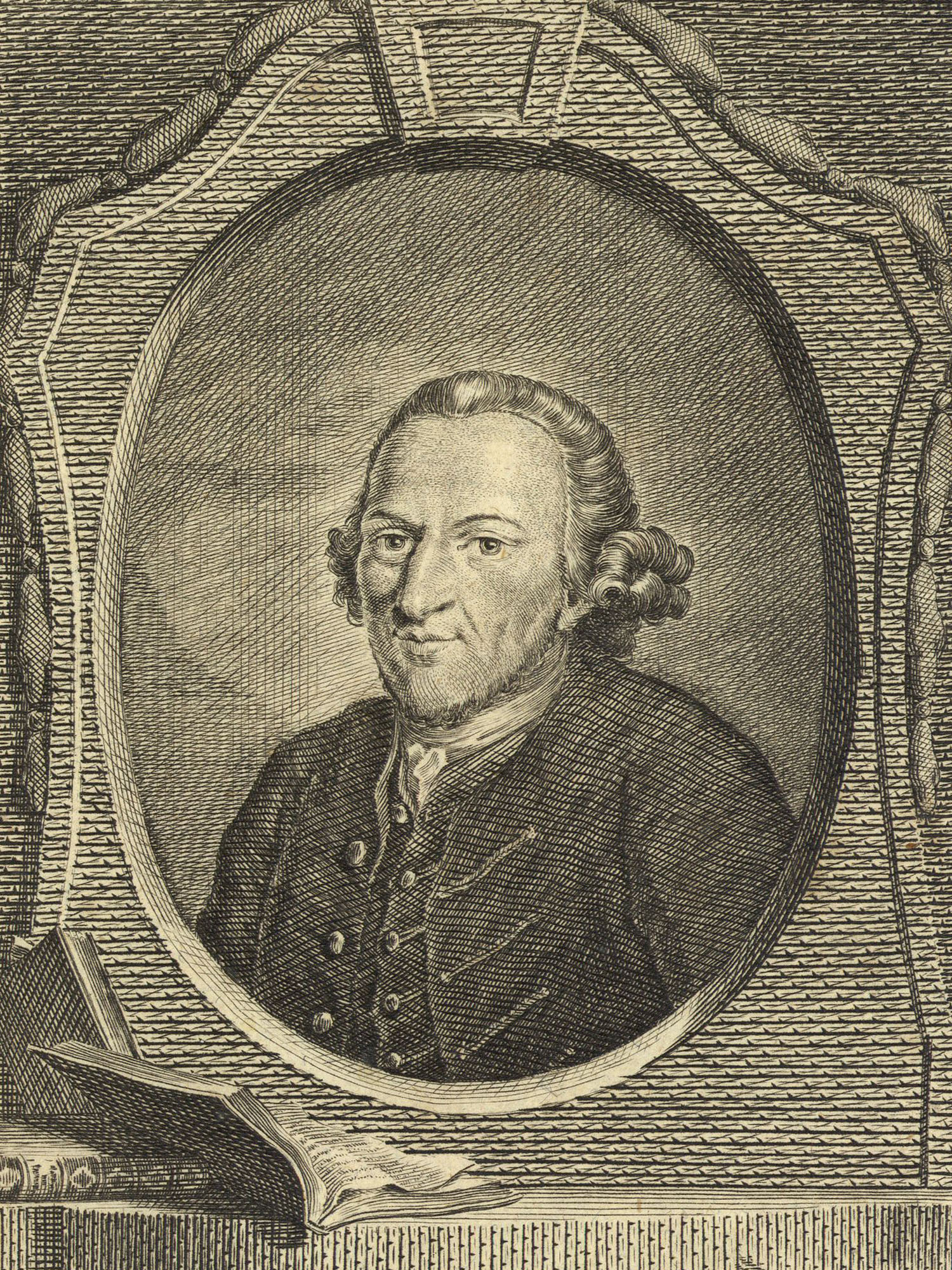 Porträt von Mendelssohn, Moses  (Allgemeine deutsche Bibliothek., 1768, 8. Bd., 1. St., ungez. Bl. am Anf. d. Bandes. [Zuschnitt auf Schmuckrahmen])