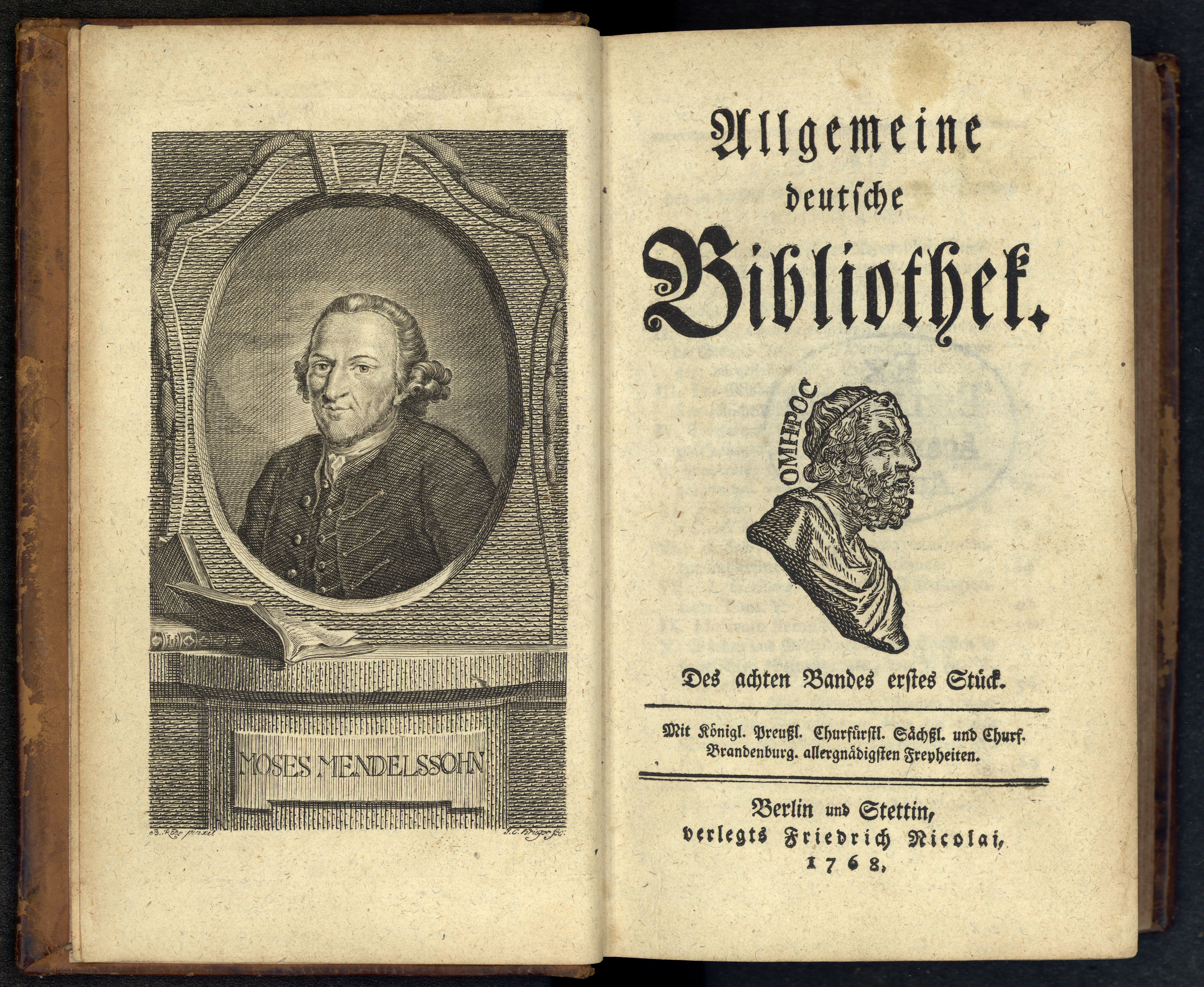 Porträt von Mendelssohn, Moses  (Allgemeine deutsche Bibliothek., 1768, 8. Bd., 1. St., ungez. Bl. am Anf. d. Bandes. [Doppelseite])