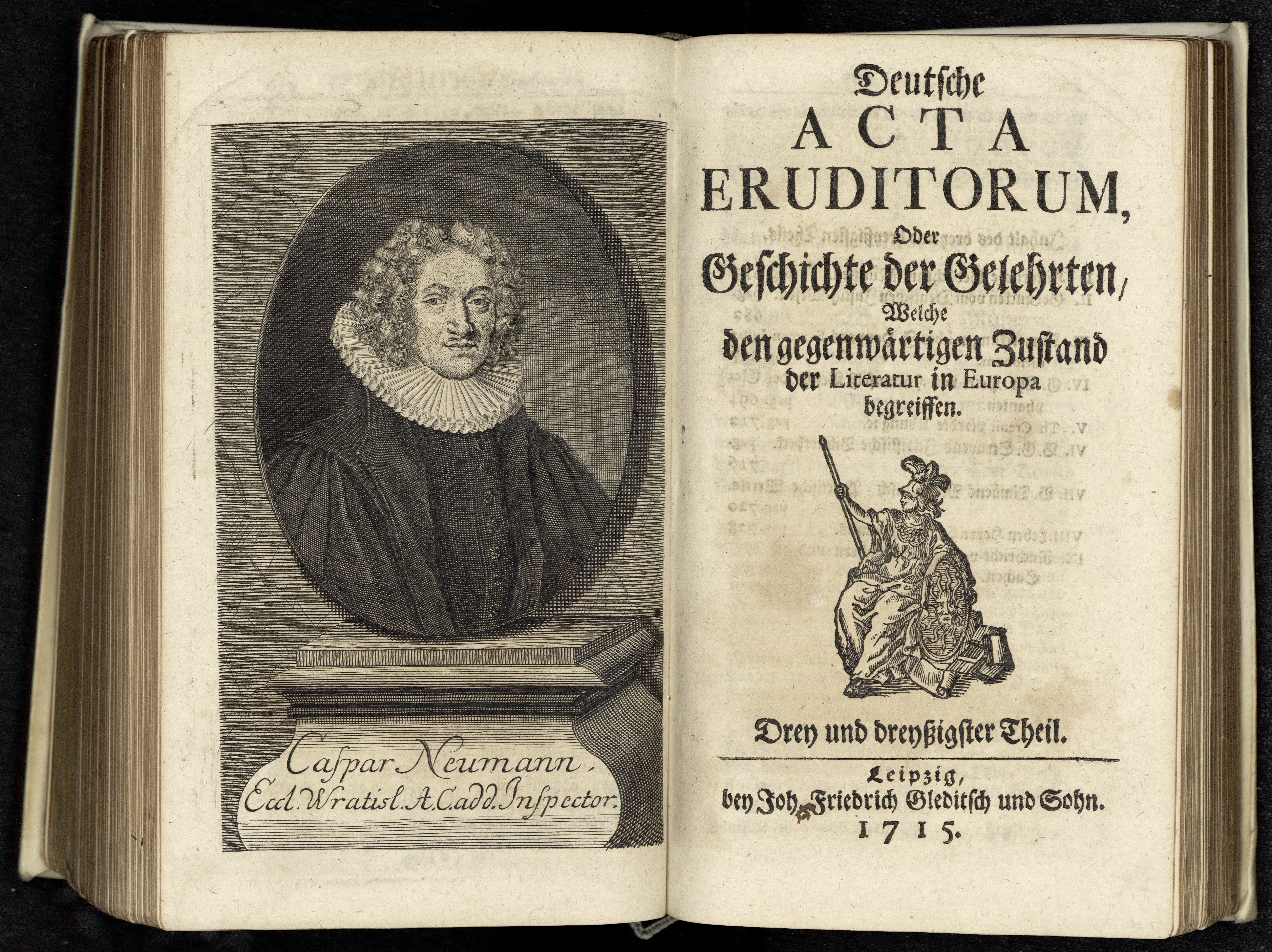 Porträt von Neumann, Caspar  (Deutsche Acta Eruditorum., 1715, 33. T., ungez. Bl. vor S. 673. [Doppelseite])