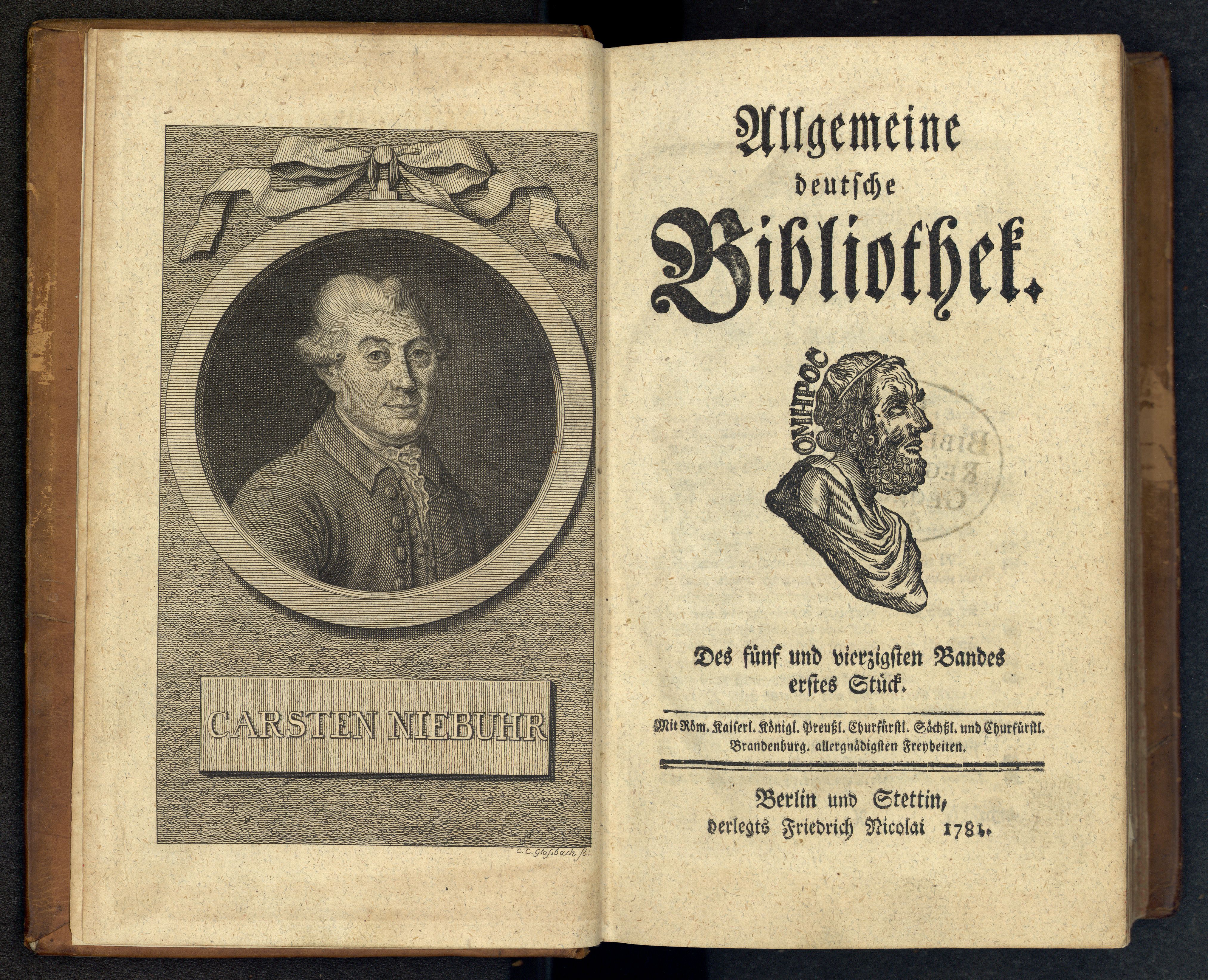 Porträt von Niebuhr, Carsten  (Allgemeine deutsche Bibliothek., 1781, 45. Bd., 1. St., ungez. Bl. am Anf. d. Bandes. [Doppelseite])