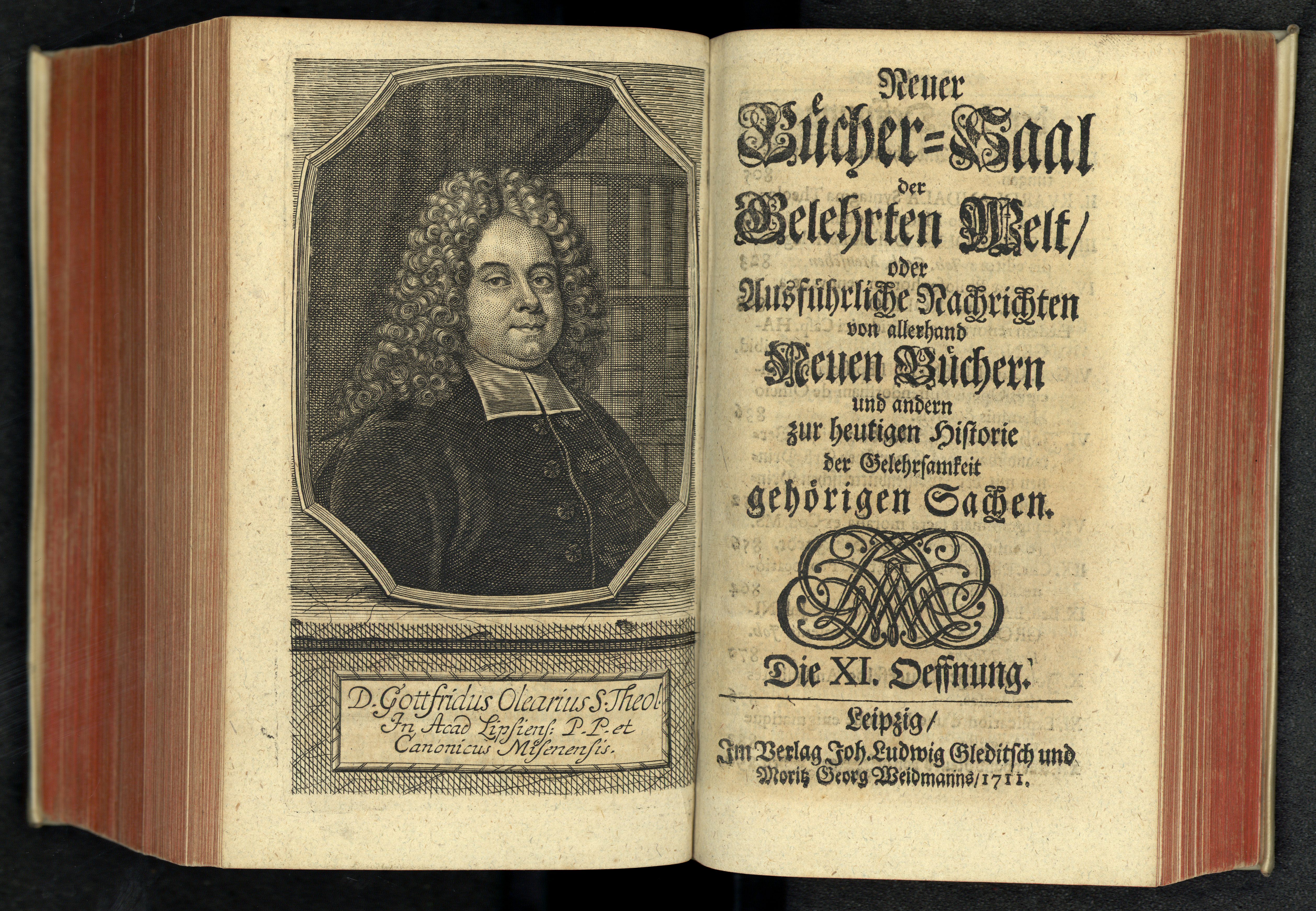 Porträt von Olearius, Gottfried  (Neuer Bücher-Saal der gelehrten Welt., 1711, 11. Oeffn., ungez. Bl. vor S. 805. [Doppelseite])