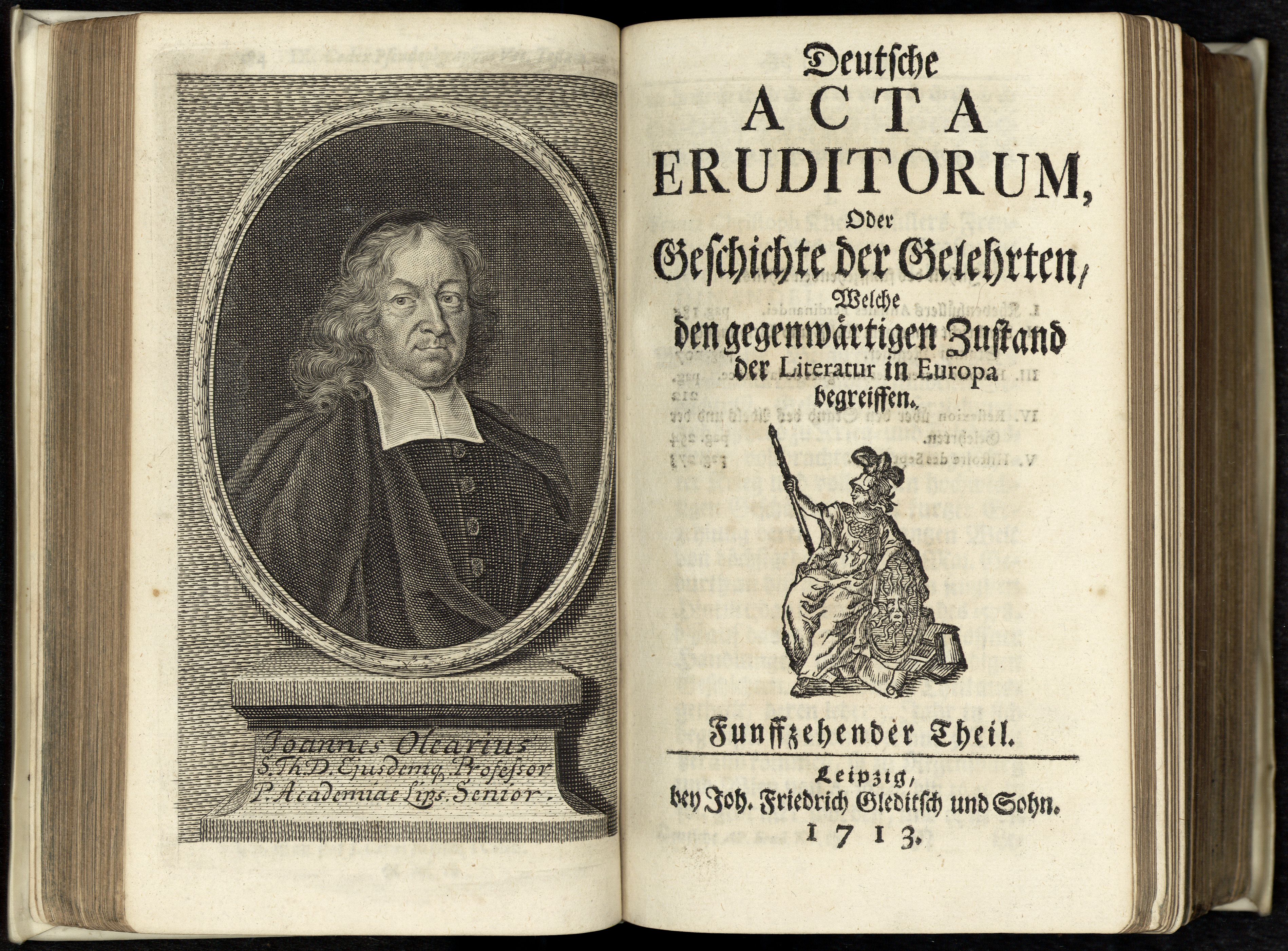 Porträt von Olearius, Johannes  (Deutsche Acta Eruditorum., 1713, 15. T., ungez. Bl. vor S. 185. [Doppelseite])