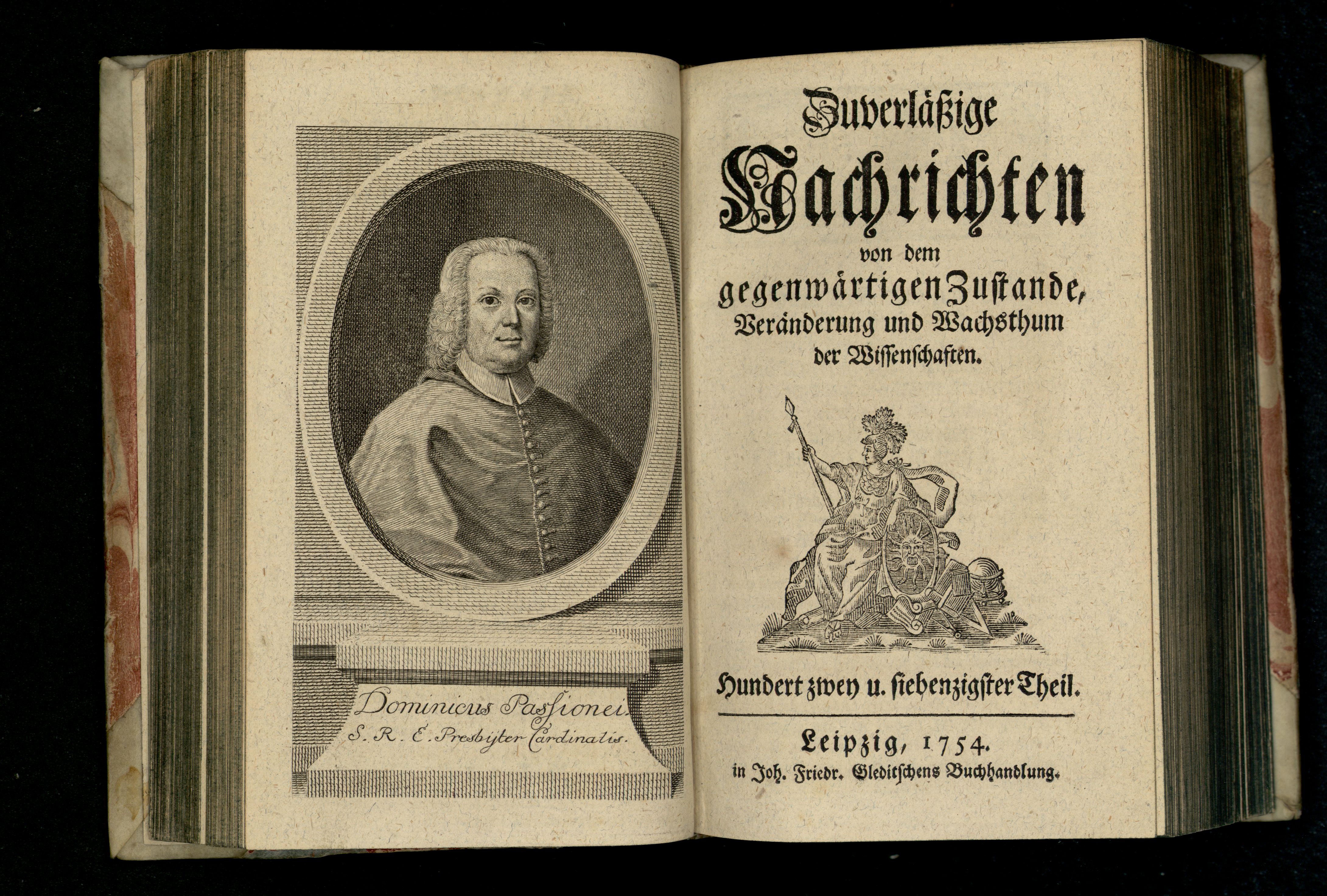 Porträt von Passionei, Domenico  (Zuverläßige Nachrichten von dem gegenwärtigen Zustande der Wissenschaften., 1754, 172. T., ungez. Bl. vor S. 238. [Doppelseite])