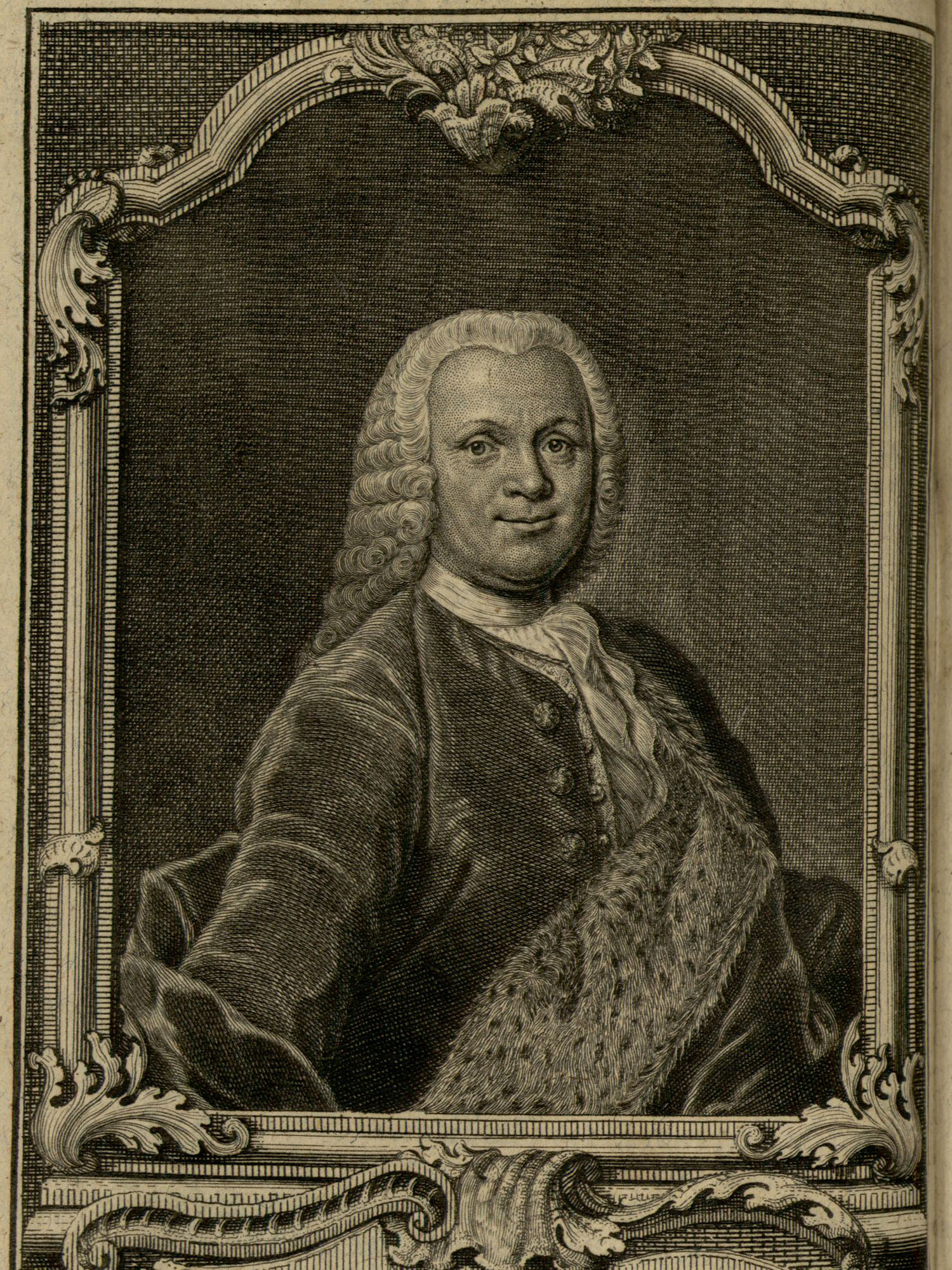 Porträt von Quelmalz, Samuel Theodor  (Zuverläßige Nachrichten von dem gegenwärtigen Zustande der Wissenschaften., 1752, 149. T., ungez. Bl. vor S. 324. [Zuschnitt auf Schmuckrahmen])