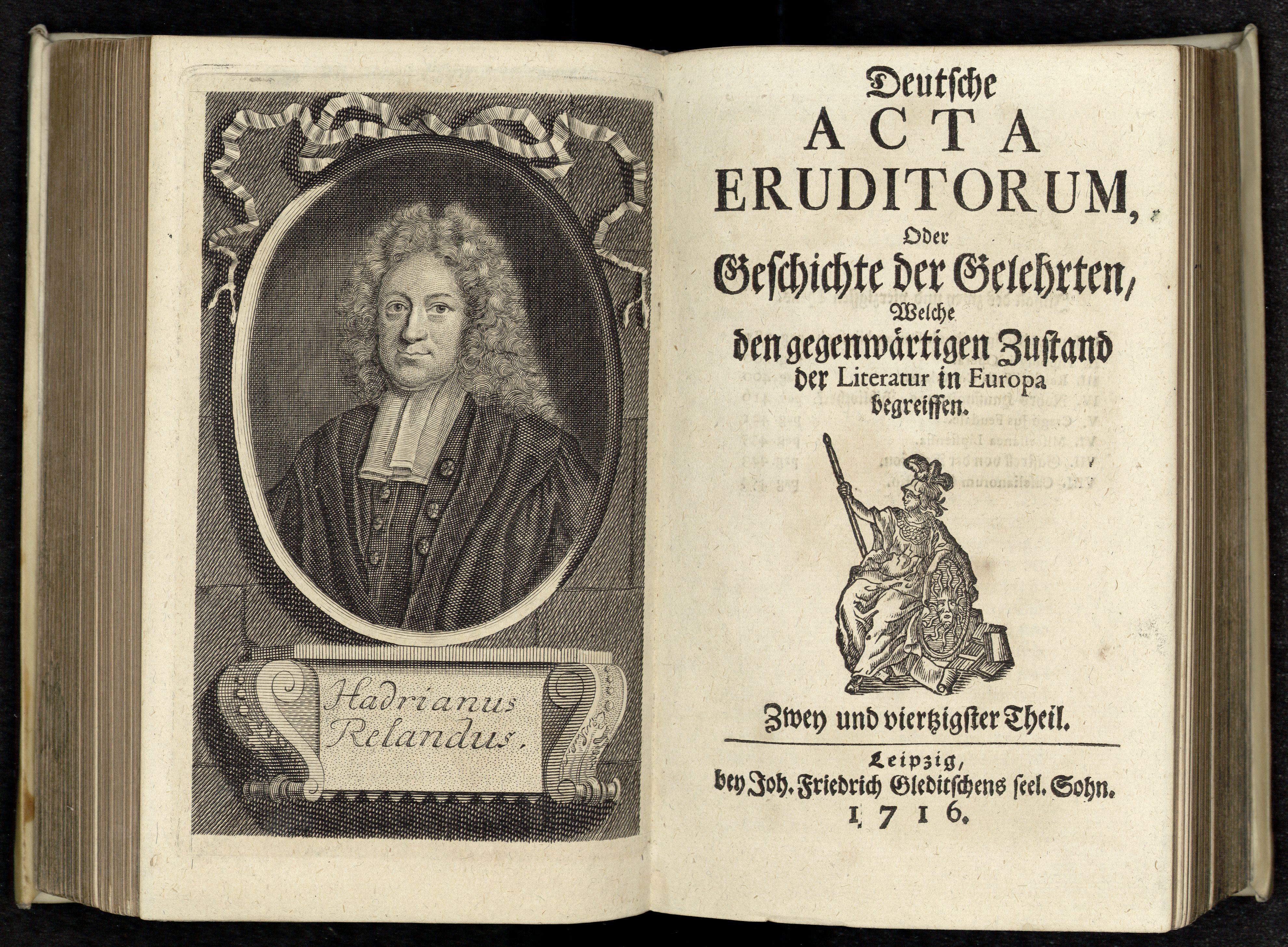 Porträt von Reelant, Adriaan  (Deutsche Acta Eruditorum., 1716, 42. T., ungez. Bl. vor S. 381. [Doppelseite])