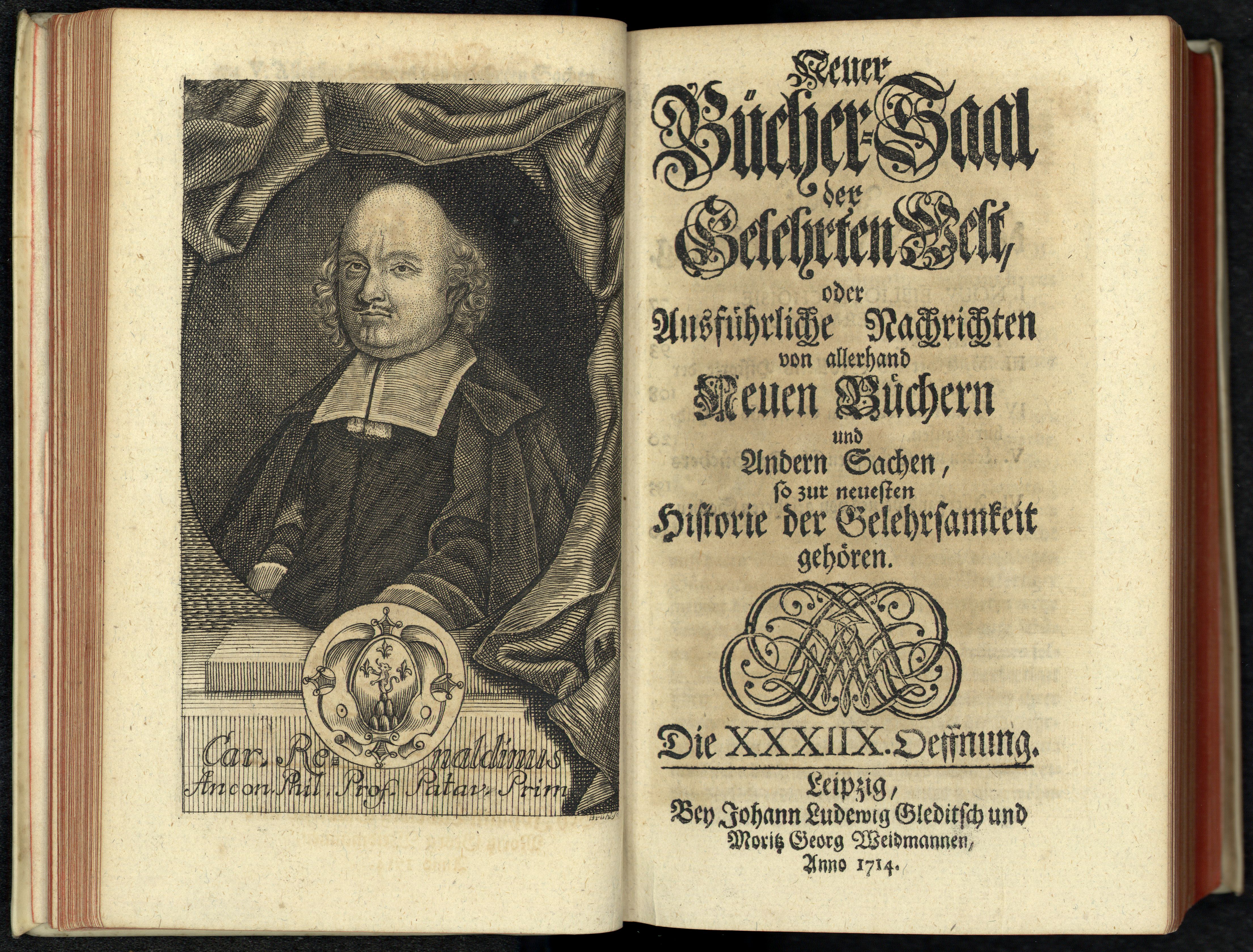 Porträt von Rinaldini, Carlo  (Neuer Bücher-Saal der gelehrten Welt., 1714, 38. Oeffn., ungez. Bl. vor S. 77. [Doppelseite])
