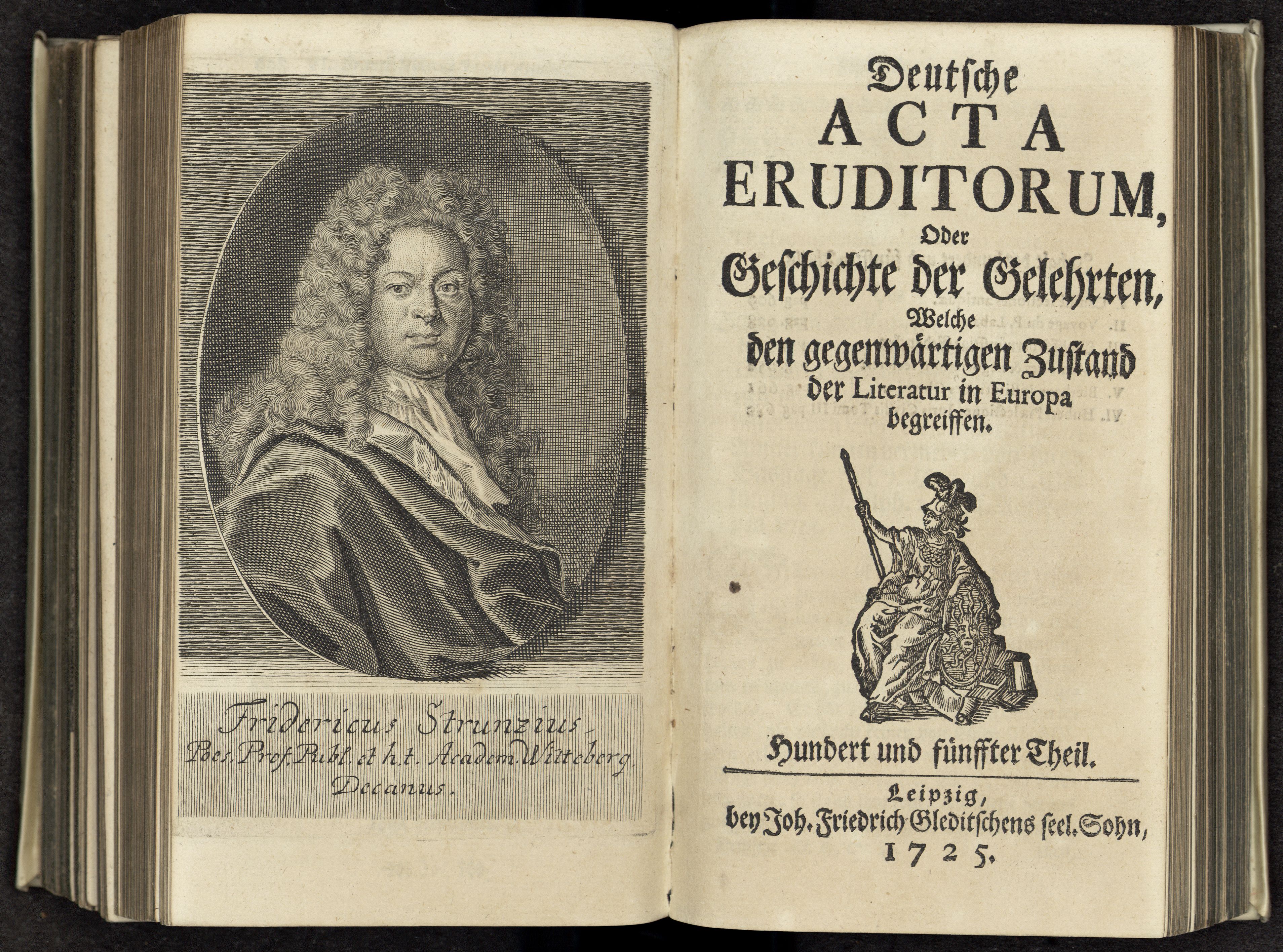 Porträt von Strunz, Friedrich  (Deutsche Acta Eruditorum., 1725, 105. T., ungez. Bl. vor S. 609. [Doppelseite])