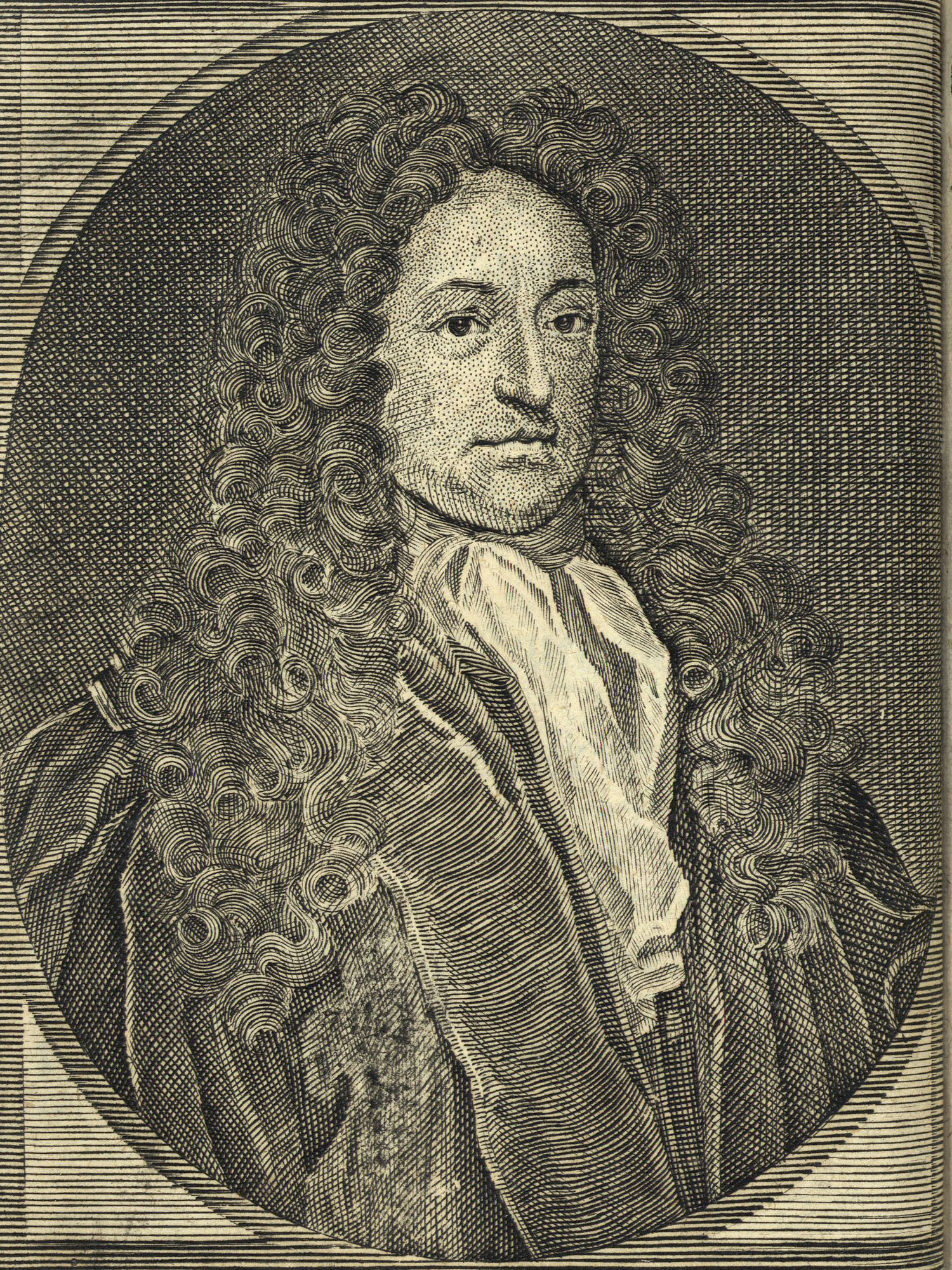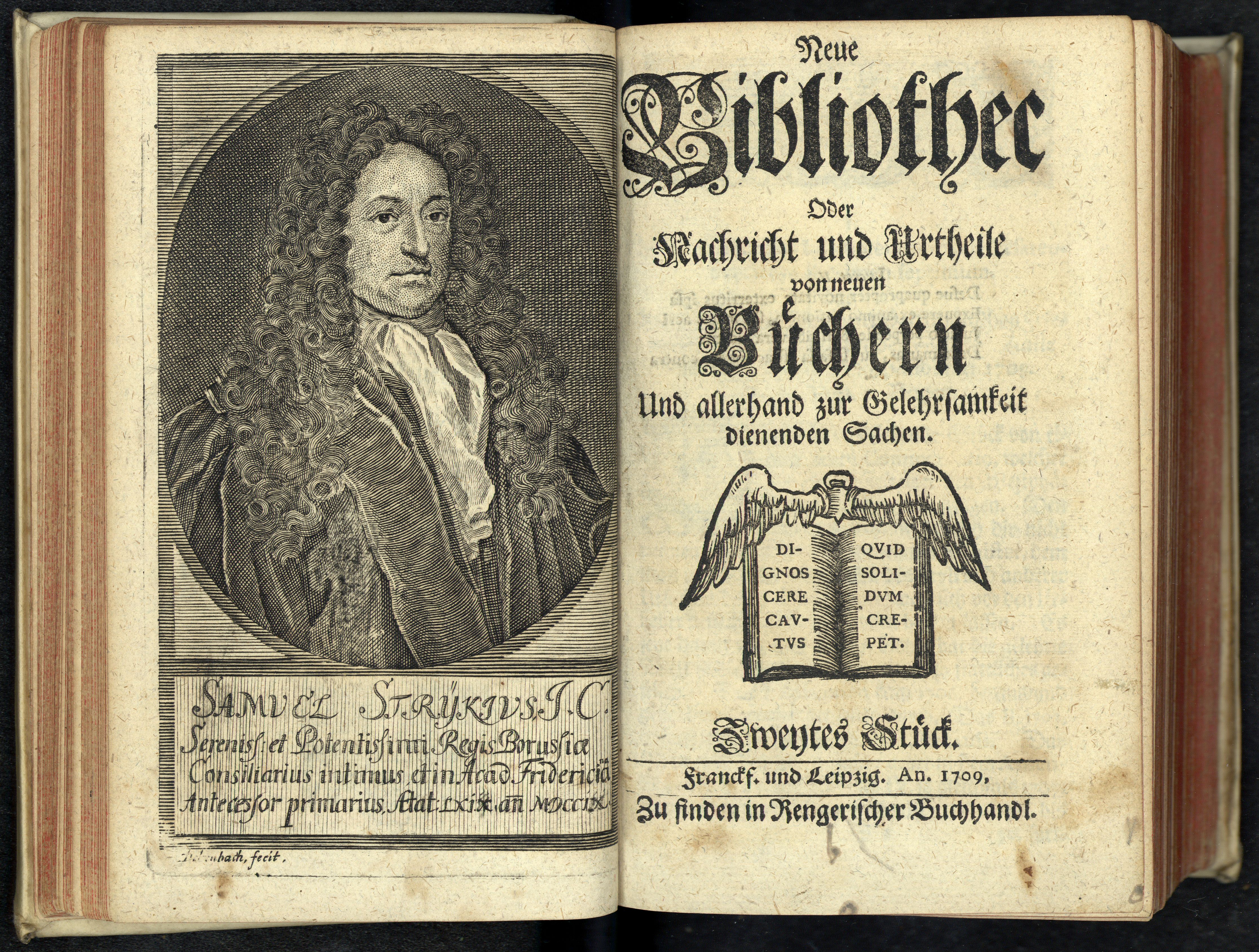 Porträt von Stryk, Samuel  (Neue Bibliothec oder Nachricht und Urtheile von neuen Büchern., 1709, 2. St., ungez. Bl. vor S. 92. [Doppelseite])