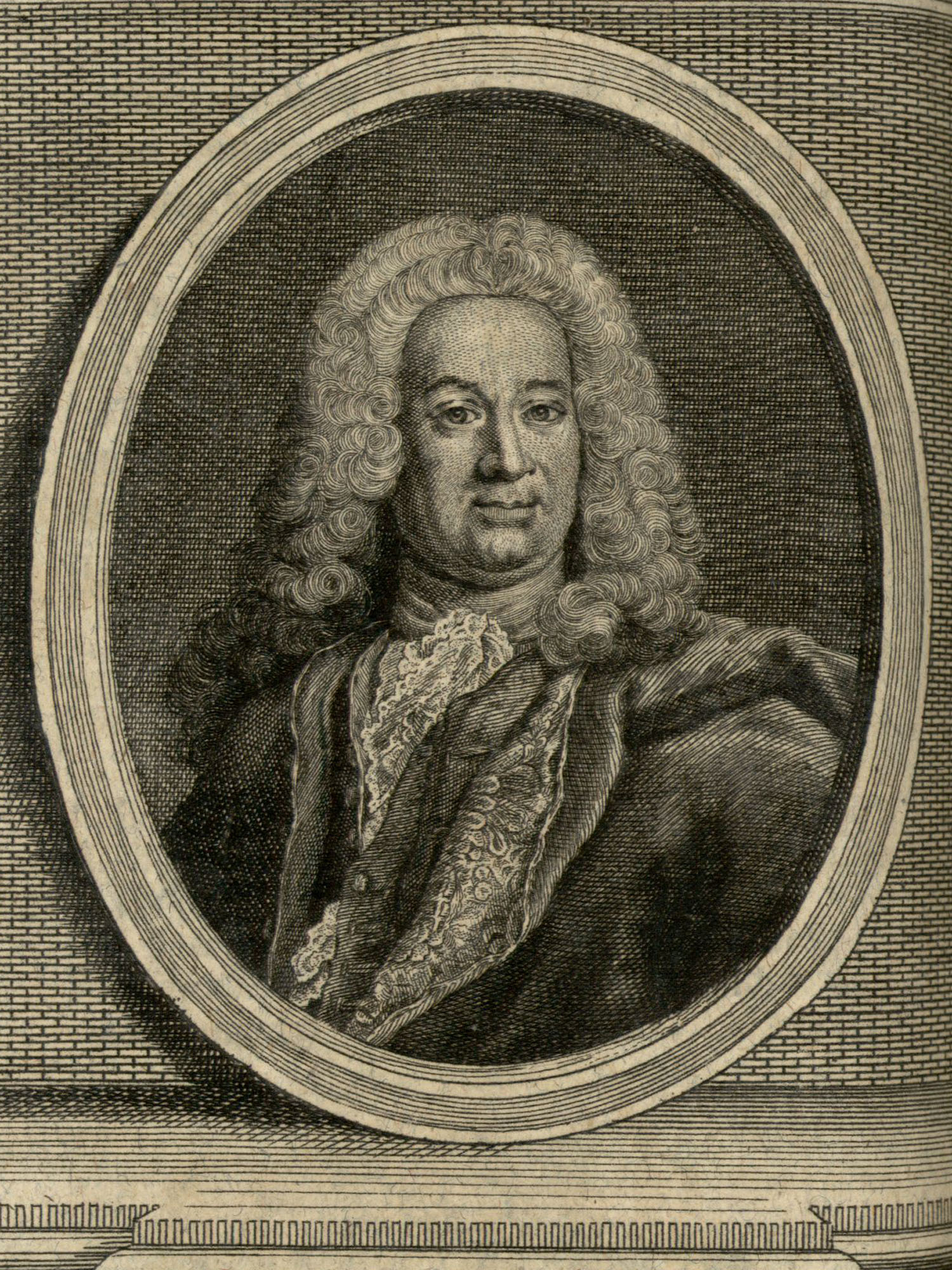 Porträt von Titon du Tillet, Evrard  (Zuverläßige Nachrichten von dem gegenwärtigen Zustande der Wissenschaften., 1755, 190. T., ungez. Bl. vor S. 700. [Zuschnitt auf Schmuckrahmen])