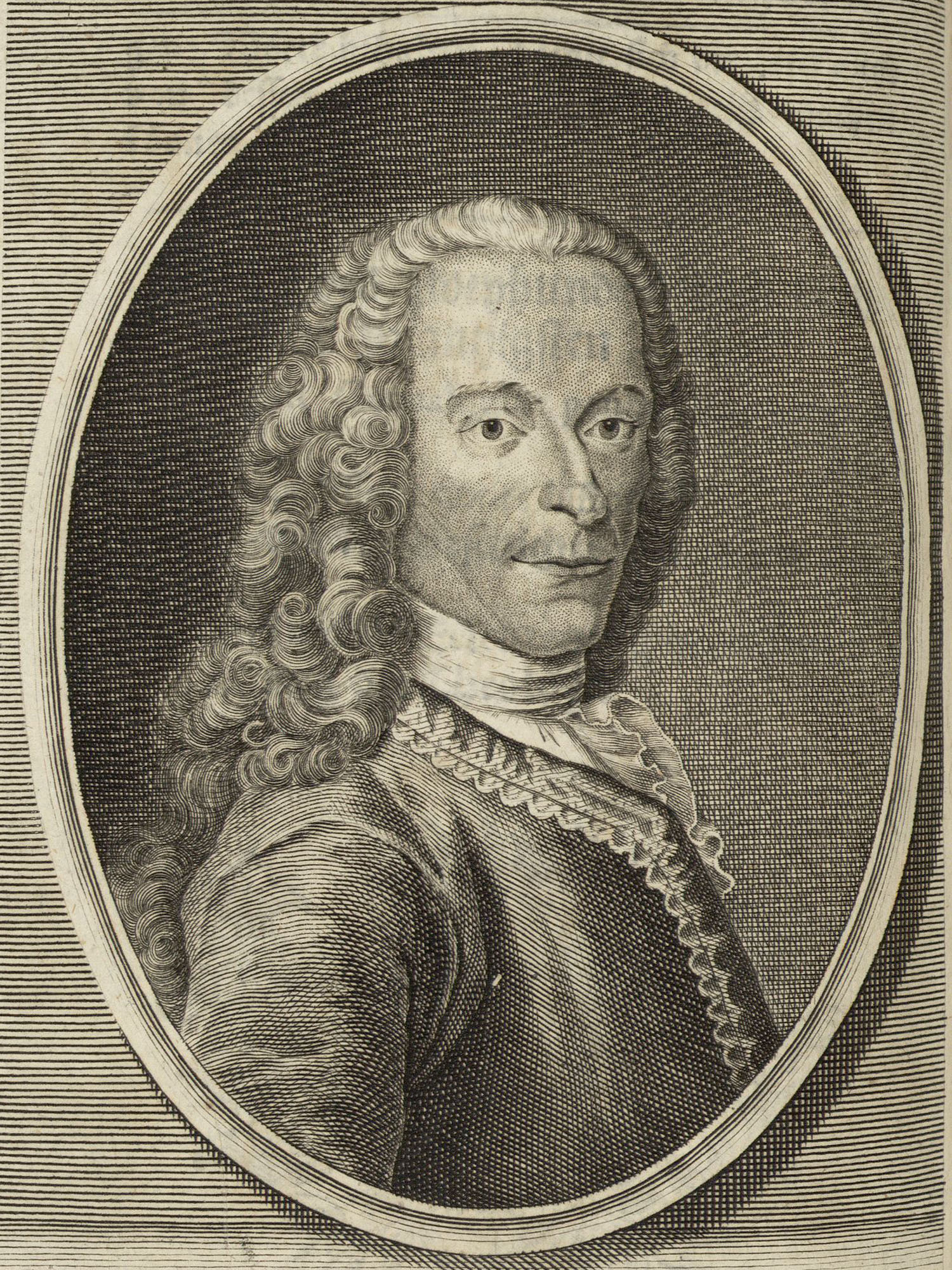 Porträt von Voltaire  (Deutsche Acta Eruditorum., 1738, 224. T., ungez. Bl. vor S. 533. [Zuschnitt auf Schmuckrahmen])