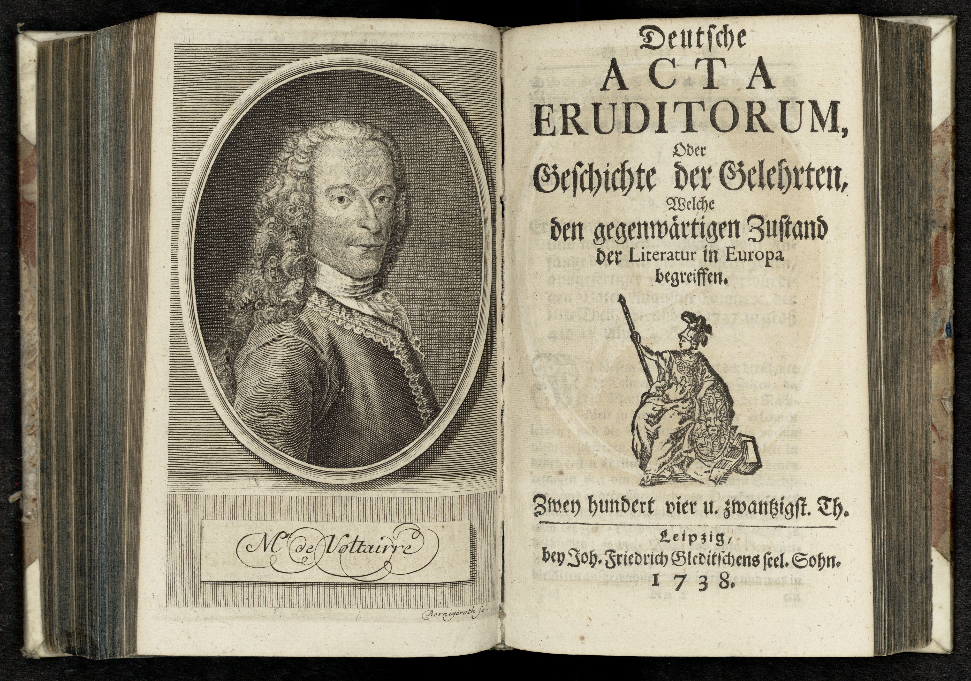 Porträt von Voltaire  (Deutsche Acta Eruditorum., 1738, 224. T., ungez. Bl. vor S. 533. [Doppelseite])
