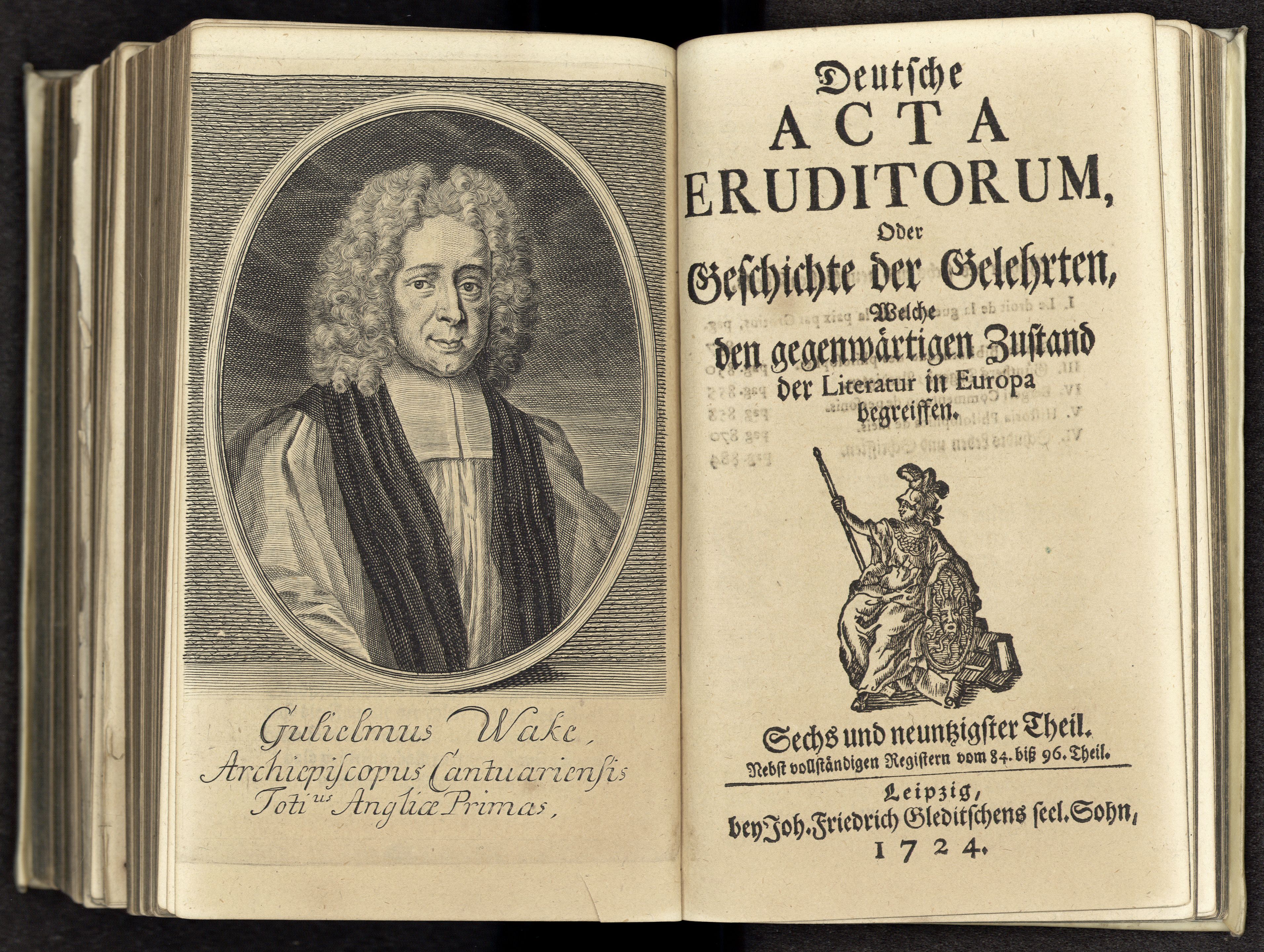 Porträt von Wake, William  (Deutsche Acta Eruditorum., 1724, 96. T., ungez. Bl. vor S. 837. [Doppelseite])