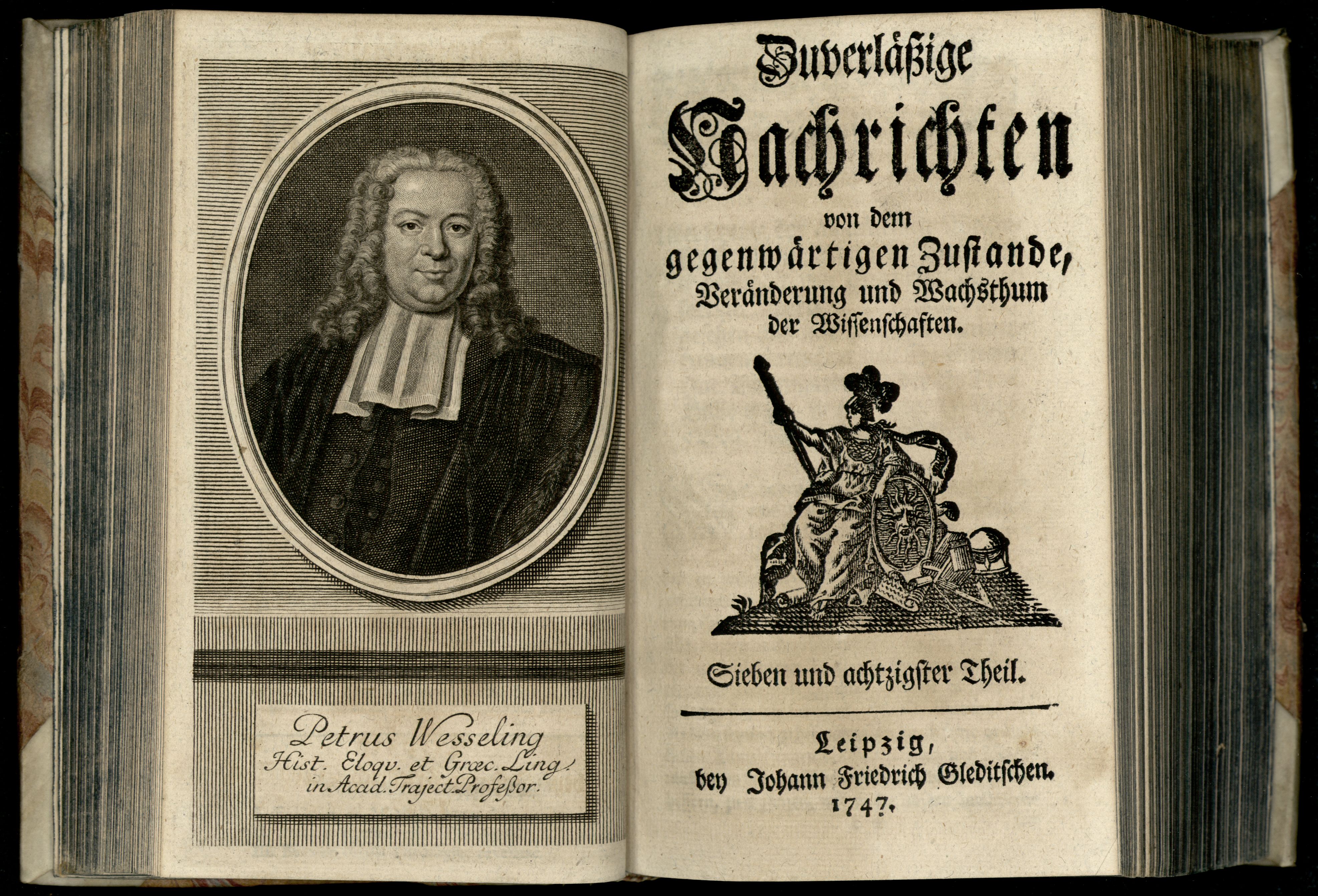 Porträt von Wesseling, Petrus  (Zuverläßige Nachrichten von dem gegenwärtigen Zustande der Wissenschaften., 1747, 87. T., ungez. Bl. vor S. 158. [Doppelseite])