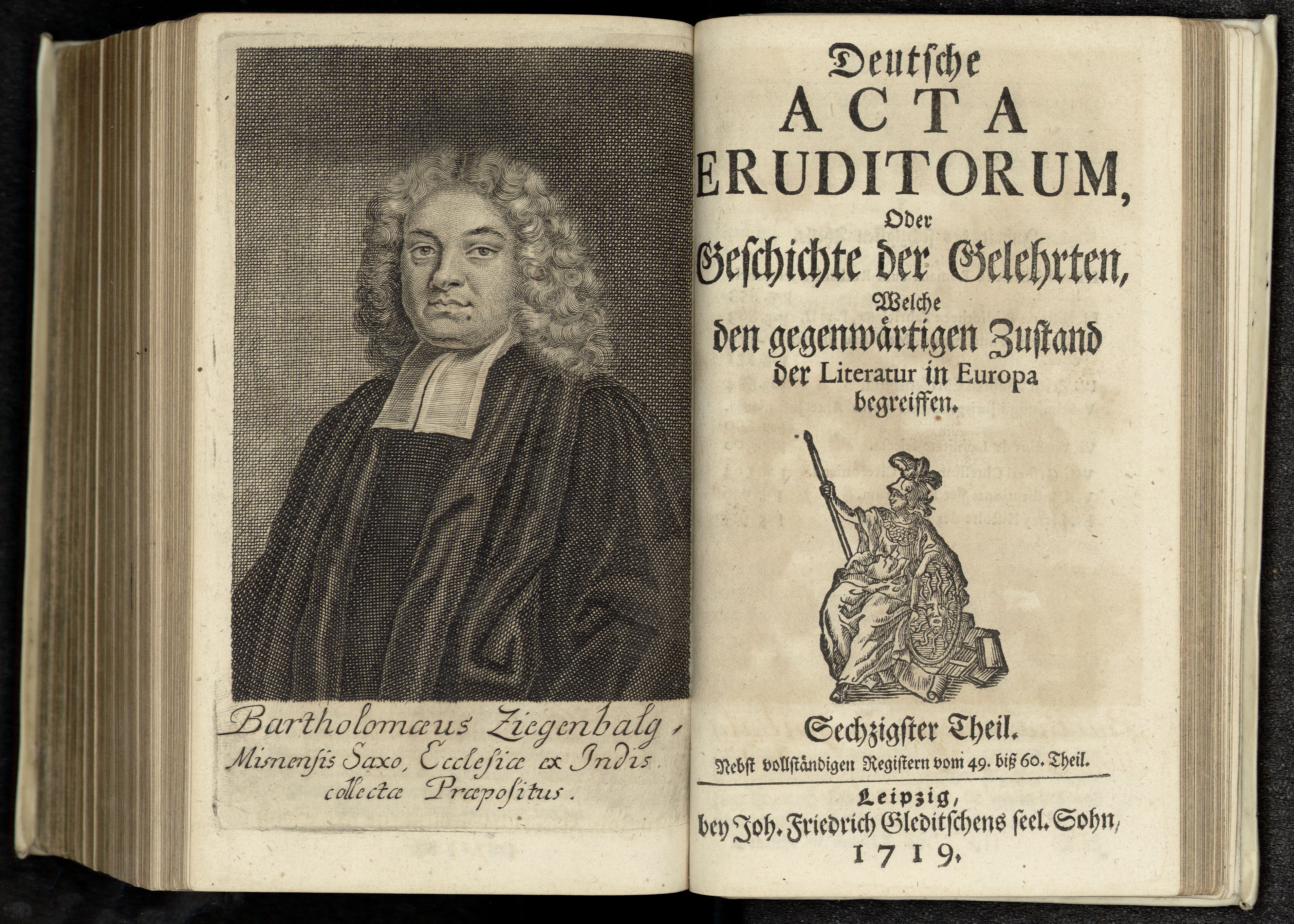 Porträt von Ziegenbalg, Bartholomäus  (Deutsche Acta Eruditorum., 1719, 60. T., ungez. Bl. vor S. 853. [Doppelseite])