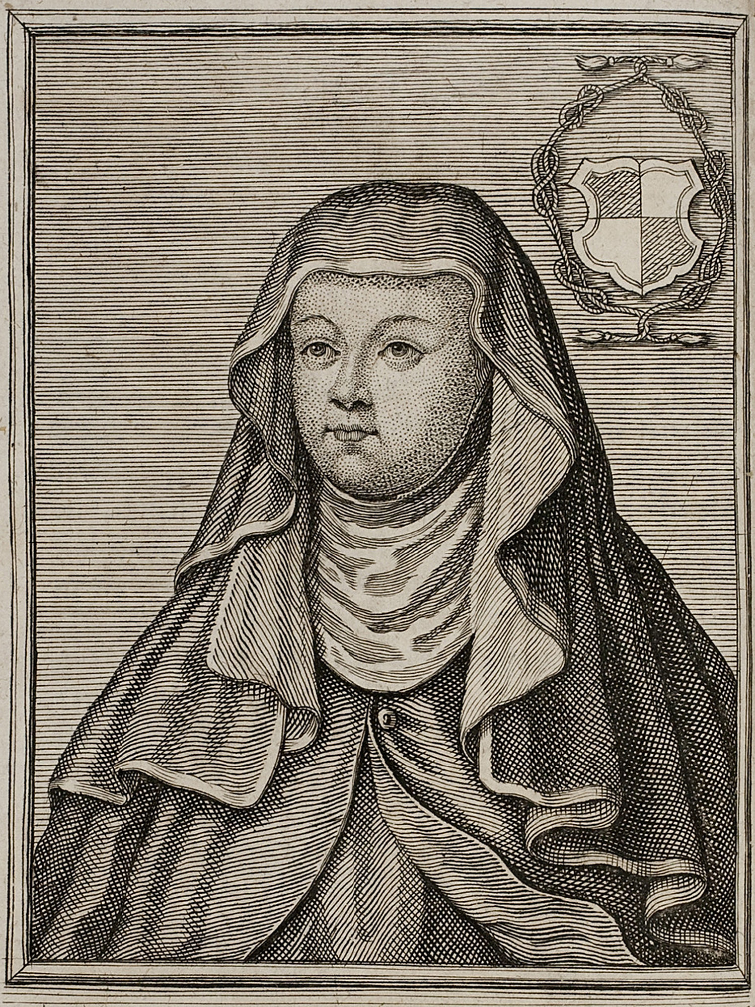 Porträt von Hrotsvita (Gandeshemensis)  (Neue Bibliothec oder Nachricht und Urtheile von neuen Büchern., 1711, 13. St., ungez. Bl. vor S. 187. [Zuschnitt auf Schmuckrahmen])