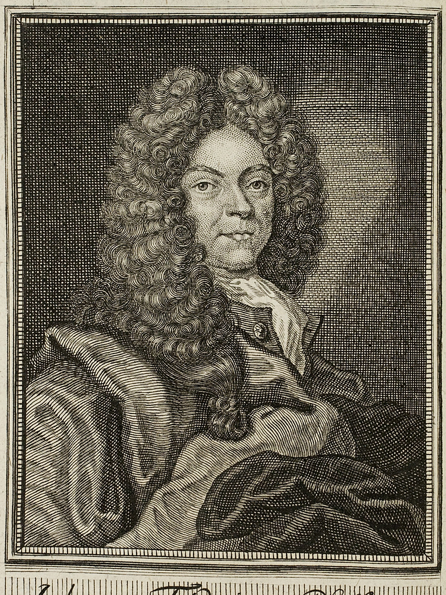 Porträt von Pfeffinger, Johann Friedrich  (Neue Bibliothec oder Nachricht und Urtheile von neuen Büchern., 1713, 23. St., ungez. Bl. vor S. 187. [Zuschnitt auf Schmuckrahmen])
