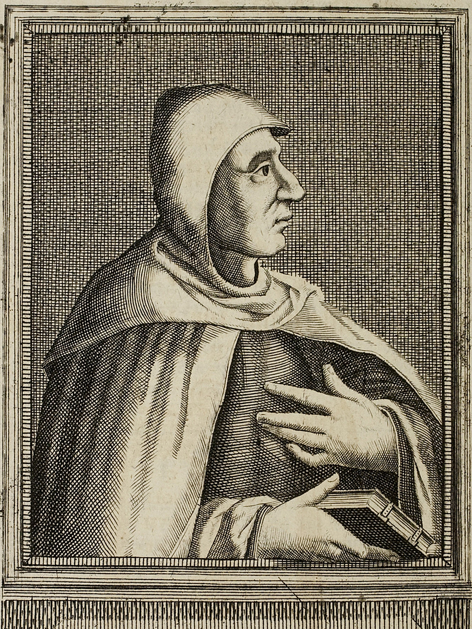 Porträt von Savonarola, Girolamo  (Neue Bibliothec oder Nachricht und Urtheile von neuen Büchern., 1713, 30. St., ungez. Bl. vor S. 831. [Zuschnitt auf Schmuckrahmen])