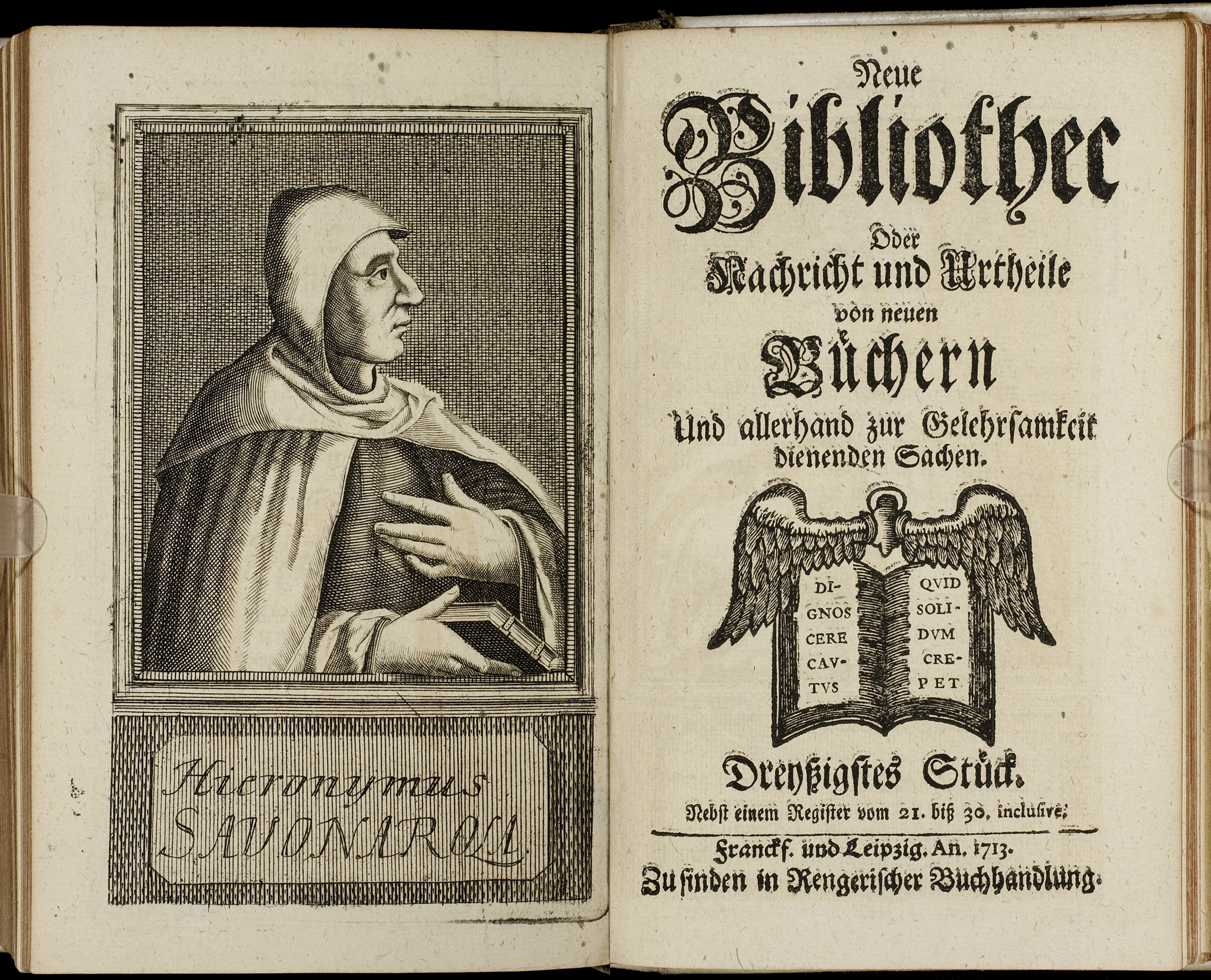 Porträt von Savonarola, Girolamo  (Neue Bibliothec oder Nachricht und Urtheile von neuen Büchern., 1713, 30. St., ungez. Bl. vor S. 831. [Doppelseite])