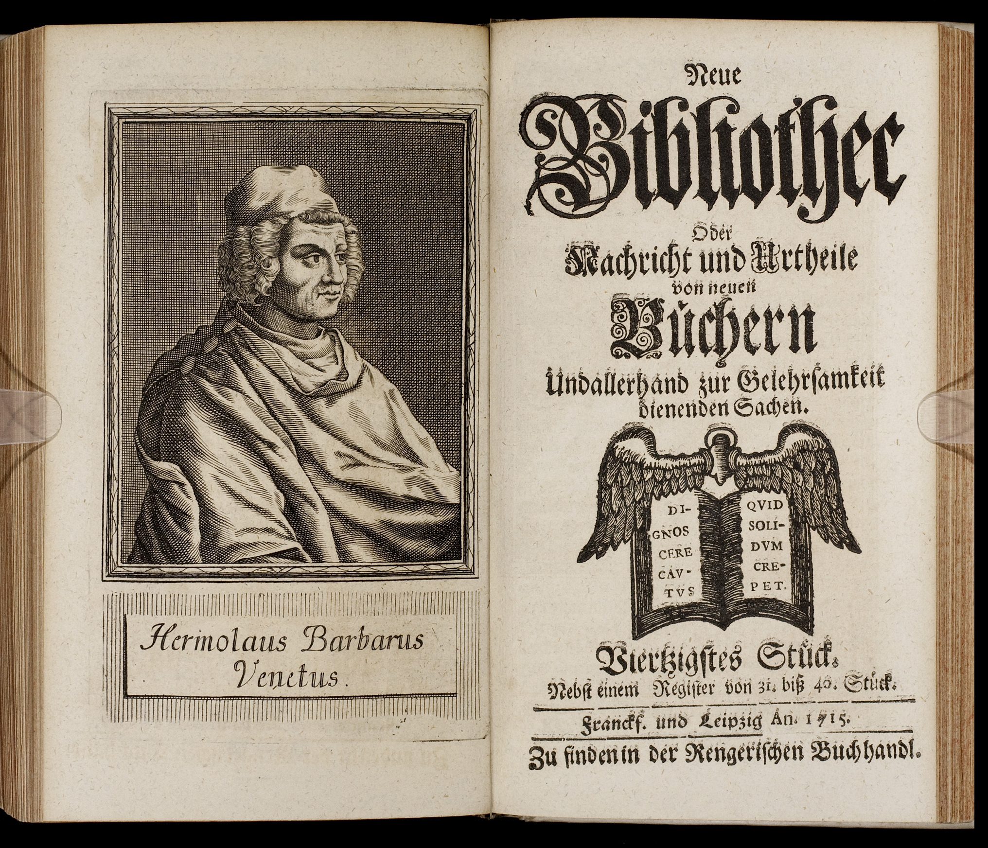 Porträt von Barbarus, Hermolaus  (Neue Bibliothec oder Nachricht und Urtheile von neuen Büchern., 1715, 40. St., ungez. Bl. vor S. 811. [Doppelseite])