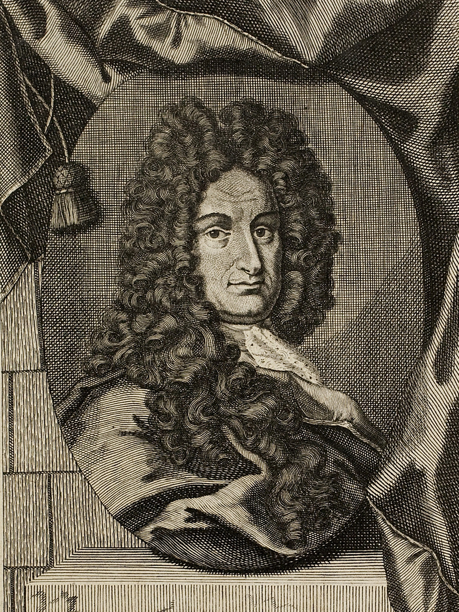 Porträt von Leibniz, Gottfried Wilhelm  (Neue Bibliothec oder Nachricht und Urtheile von neuen Büchern., 1718, 66. St., ungez. Bl. vor S. 1. [Zuschnitt auf Schmuckrahmen])