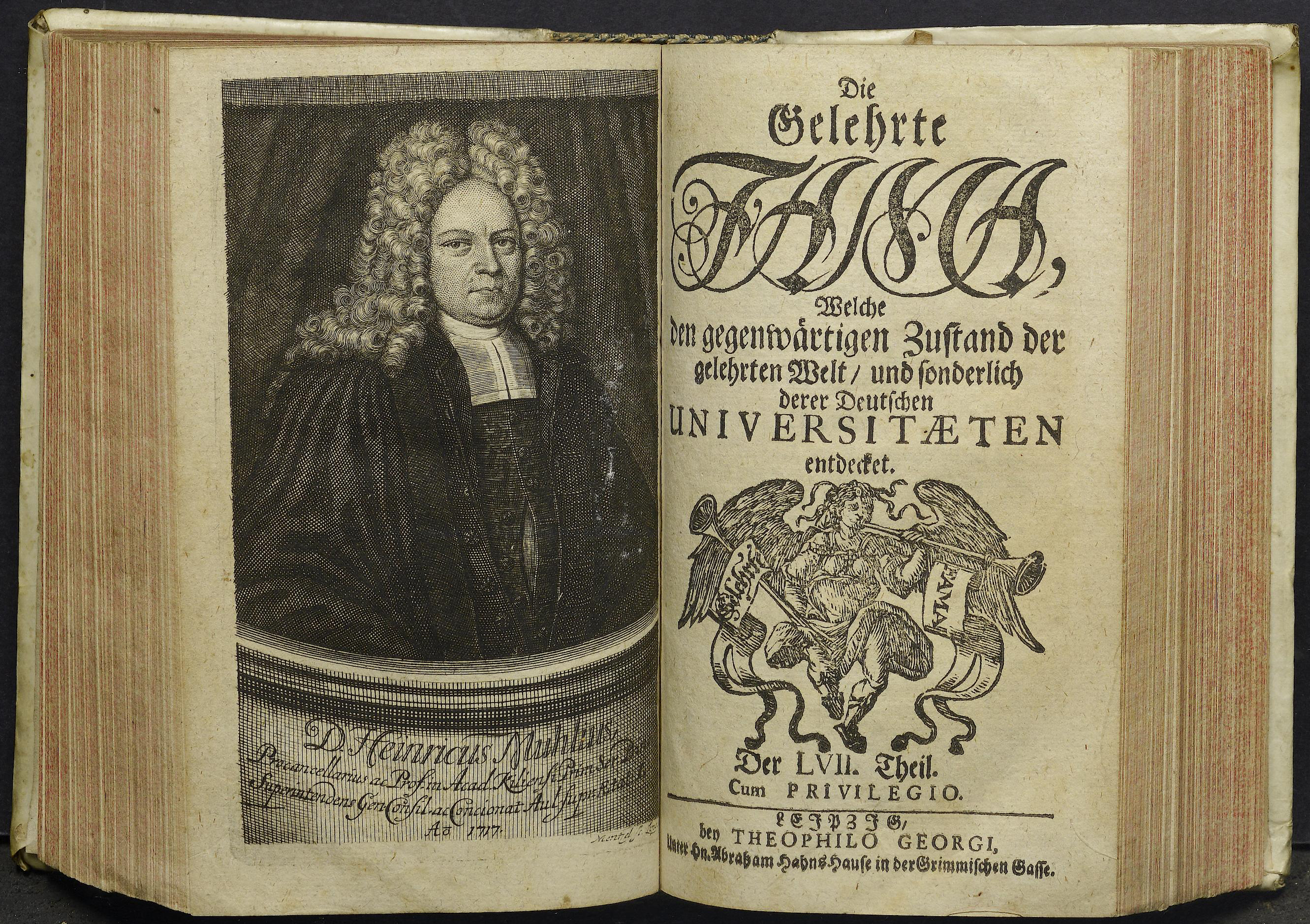 Porträt von Muhlius, Heinrich  (Die Gelehrte Fama, welche den gegenwärtigen Zustand der gelehrten Welt und sonderlich derer deutschen Universitäten entdecket., 1717, 57. T., ungez. Bl. am Anf. d. Stückes. [Doppelseite])