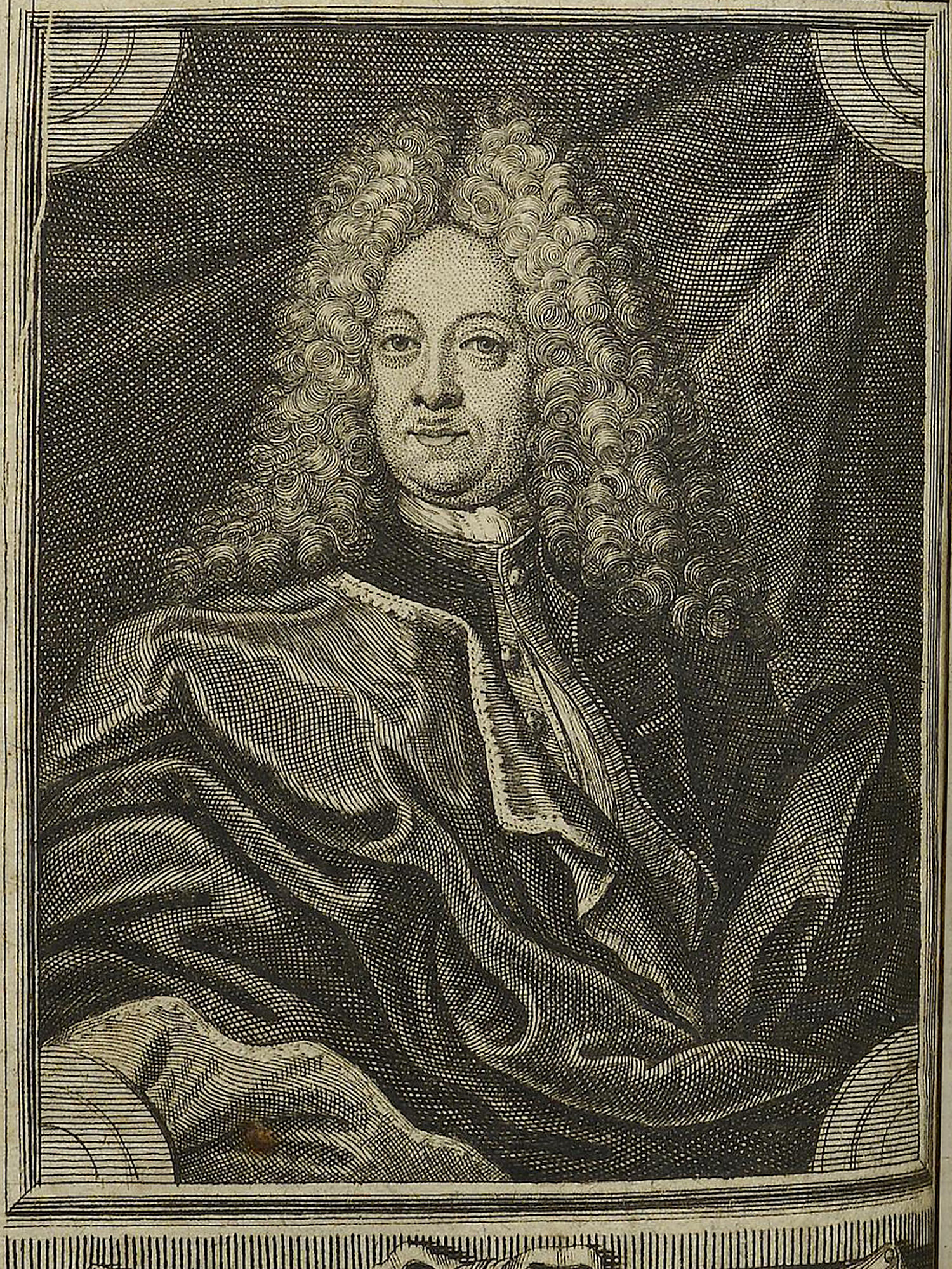 Porträt von Mylius, Johann Heinrich  (Die Gelehrte Fama, welche den gegenwärtigen Zustand der gelehrten Welt und sonderlich derer deutschen Universitäten entdecket., 1717, 56. T., ungez. Bl. am Anf. d. Stückes. [Zuschnitt auf Schmuckrahmen])
