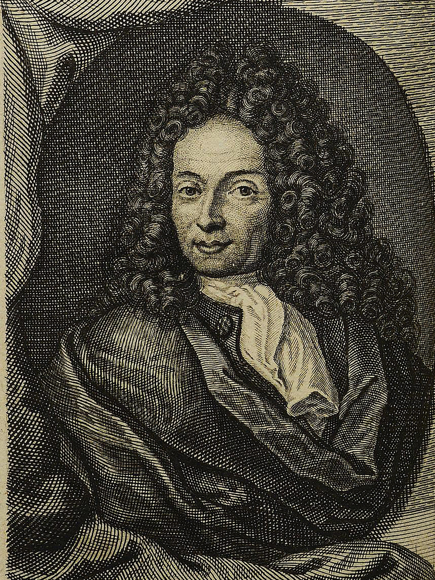 Porträt von Rüdiger, Andreas  (Die Gelehrte Fama, welche den gegenwärtigen Zustand der gelehrten Welt und sonderlich derer deutschen Universitäten entdecket., 1716, 45. T., ungez. Bl. am Anf. d. Stückes. [Zuschnitt auf Schmuckrahmen])