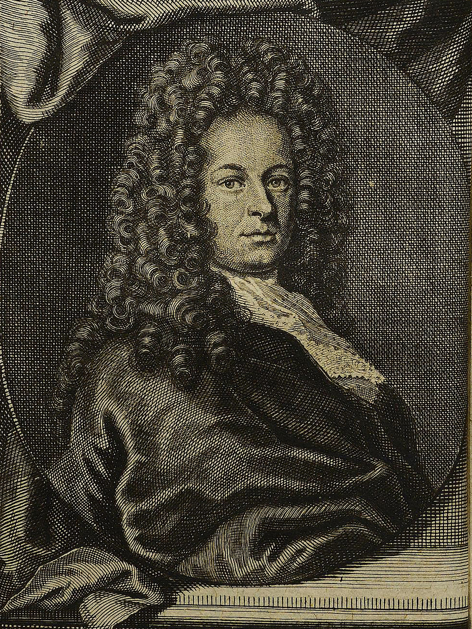 Porträt von Sturm, Leonhard Christoph  (Die Gelehrte Fama, welche den gegenwärtigen Zustand der gelehrten Welt und sonderlich derer deutschen Universitäten entdecket., 1715, 39. T., ungez. Bl. am Anf. d. Stückes. [Zuschnitt auf Schmuckrahmen])