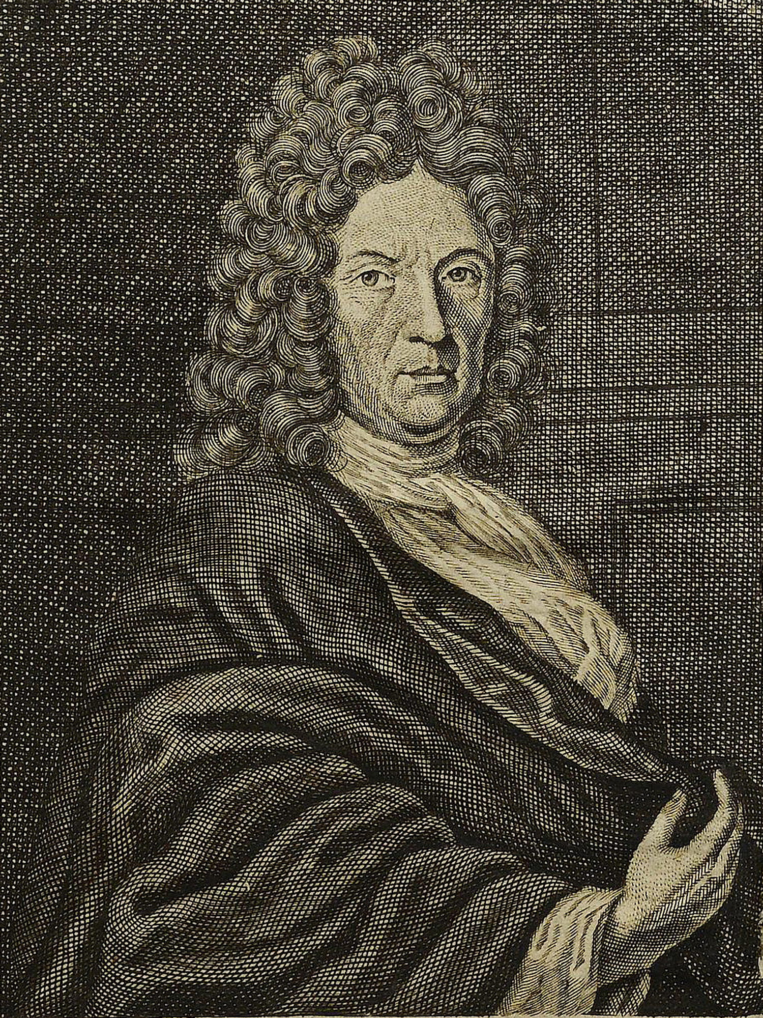 Porträt von Fabricius, Johann  (Die Gelehrte Fama, welche den gegenwärtigen Zustand der gelehrten Welt und sonderlich derer deutschen Universitäten entdecket., 1715, 37/38. T., ungez. Bl. am Anf. d. Stückes. [Zuschnitt auf Schmuckrahmen])