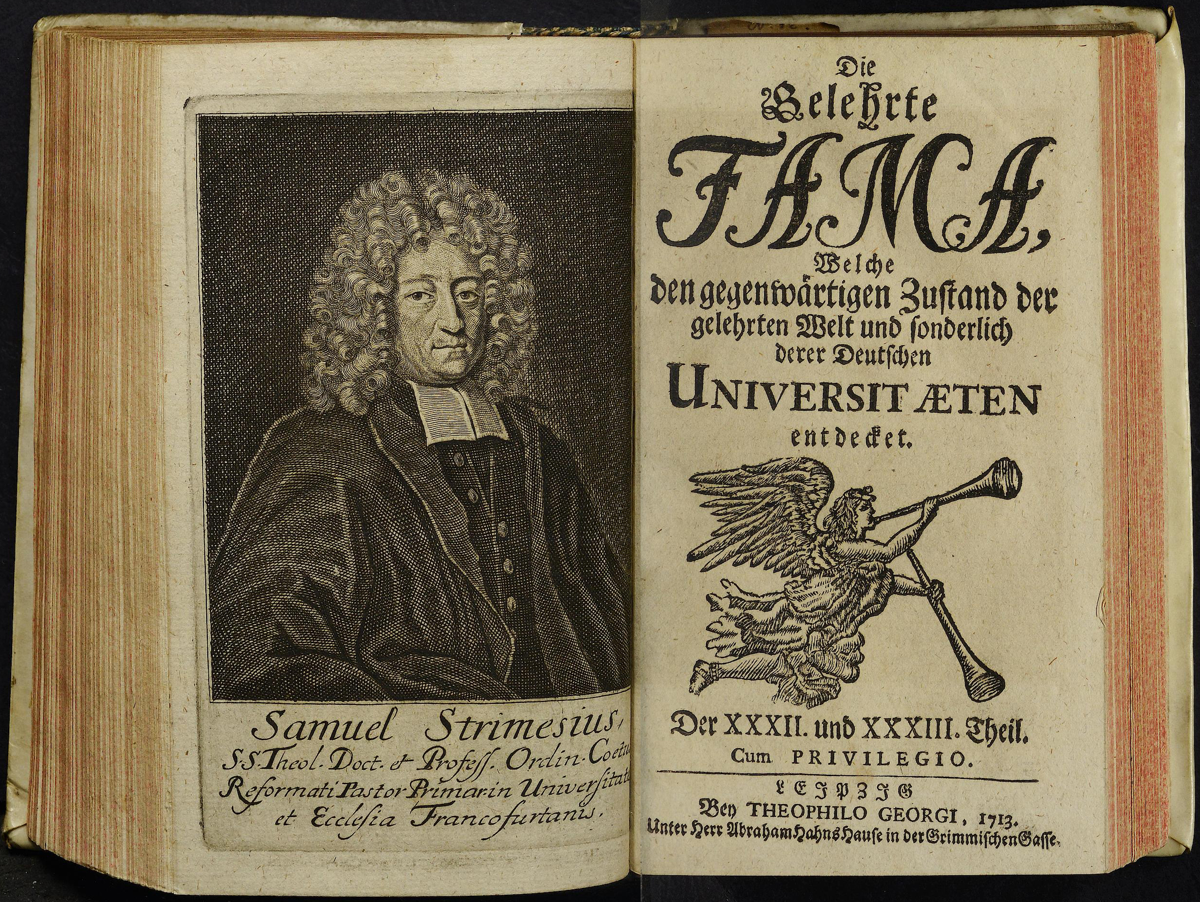 Porträt von Strimesius, Samuel  (Die Gelehrte Fama, welche den gegenwärtigen Zustand der gelehrten Welt und sonderlich derer deutschen Universitäten entdecket., 1714, 32/33. T., ungez. Bl. am Anf. d. Stückes. [Doppelseite])