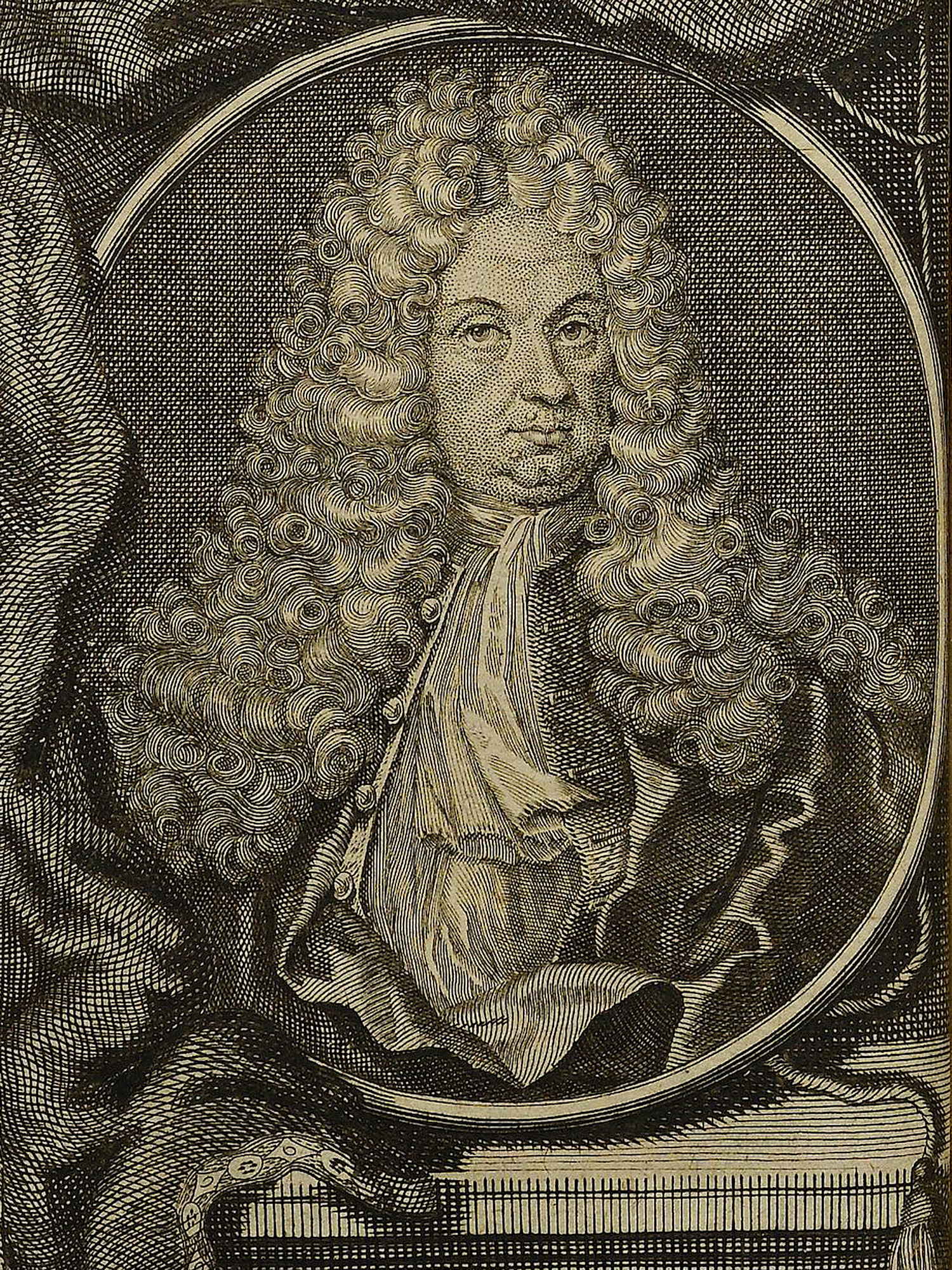 Porträt von Cocceji, Heinrich von  (Die Gelehrte Fama, welche den gegenwärtigen Zustand der gelehrten Welt und sonderlich derer deutschen Universitäten entdecket., 1714, 29. T., ungez. Bl. am Anf. d. Stückes. [Zuschnitt auf Schmuckrahmen])