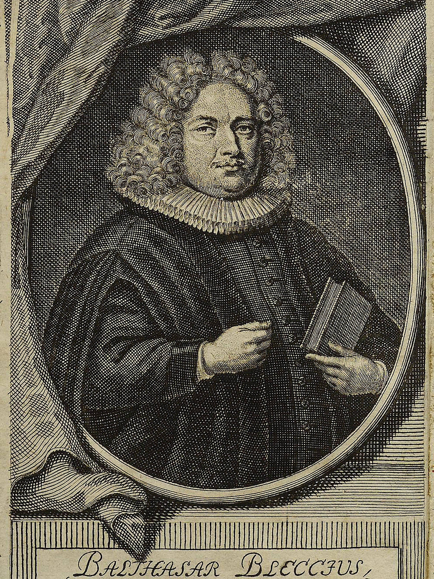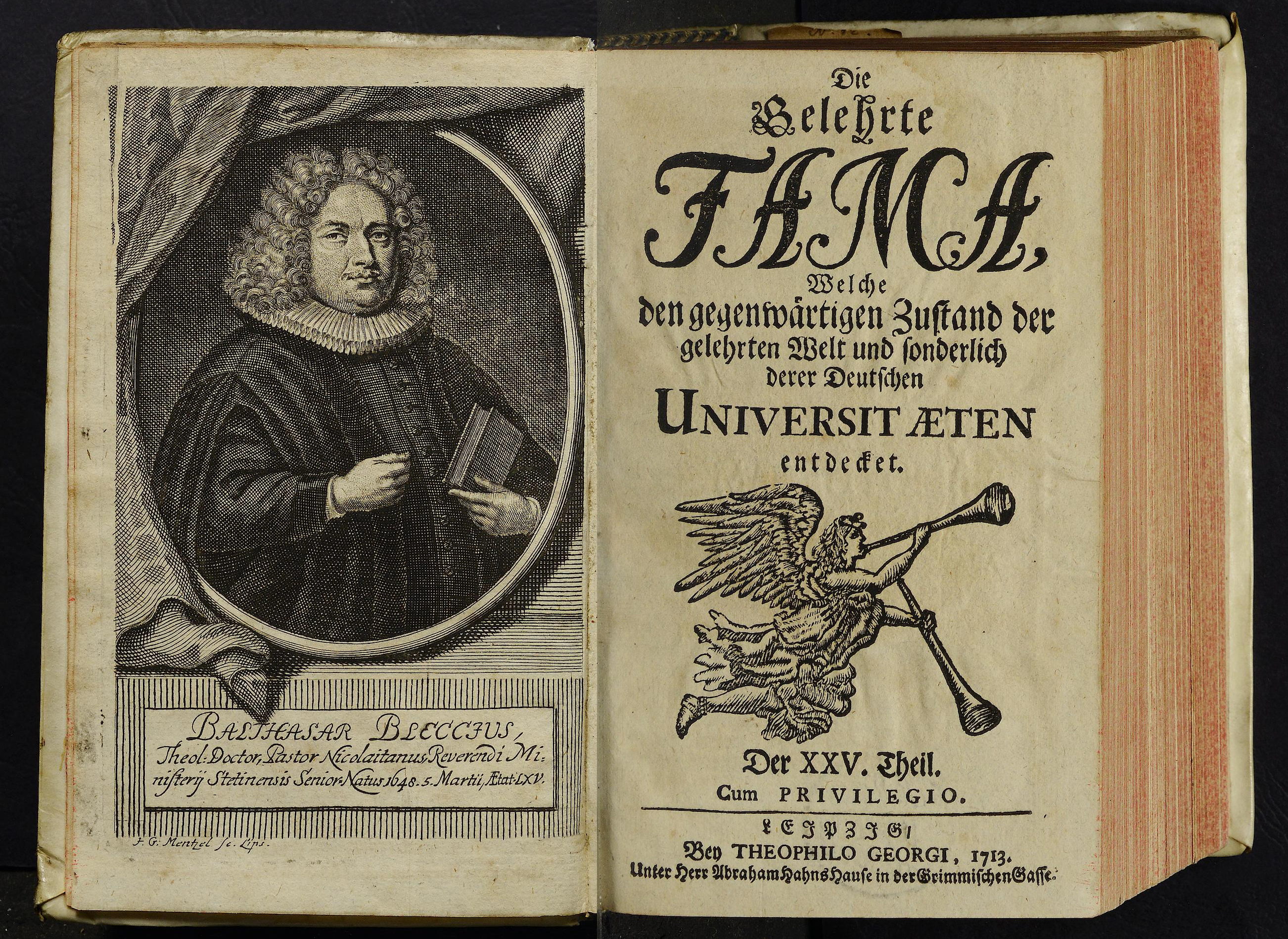 Porträt von Blecc, Balthasar  (Die Gelehrte Fama, welche den gegenwärtigen Zustand der gelehrten Welt und sonderlich derer deutschen Universitäten entdecket., 1713, 25. T., ungez. Bl. am Anf. d. Stückes. [Doppelseite])