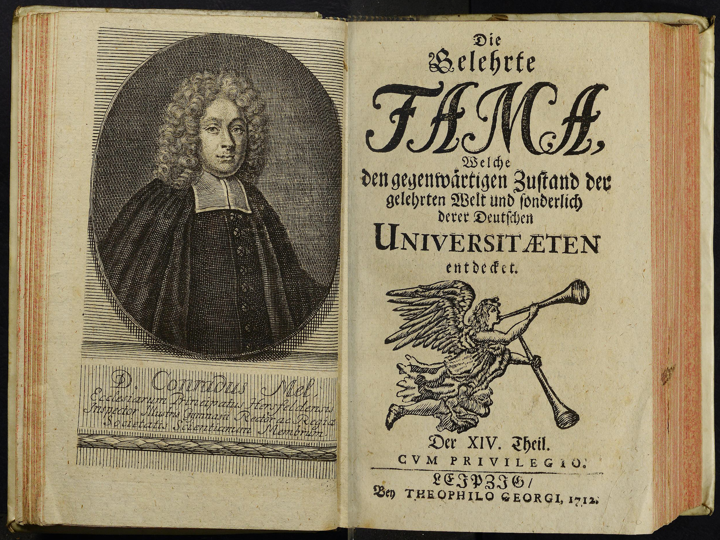 Porträt von Mel, Conrad  (Die Gelehrte Fama, welche den gegenwärtigen Zustand der gelehrten Welt und sonderlich derer deutschen Universitäten entdecket., 1712, 14. T., ungez. Bl. am Anf. d. Stückes. [Doppelseite])