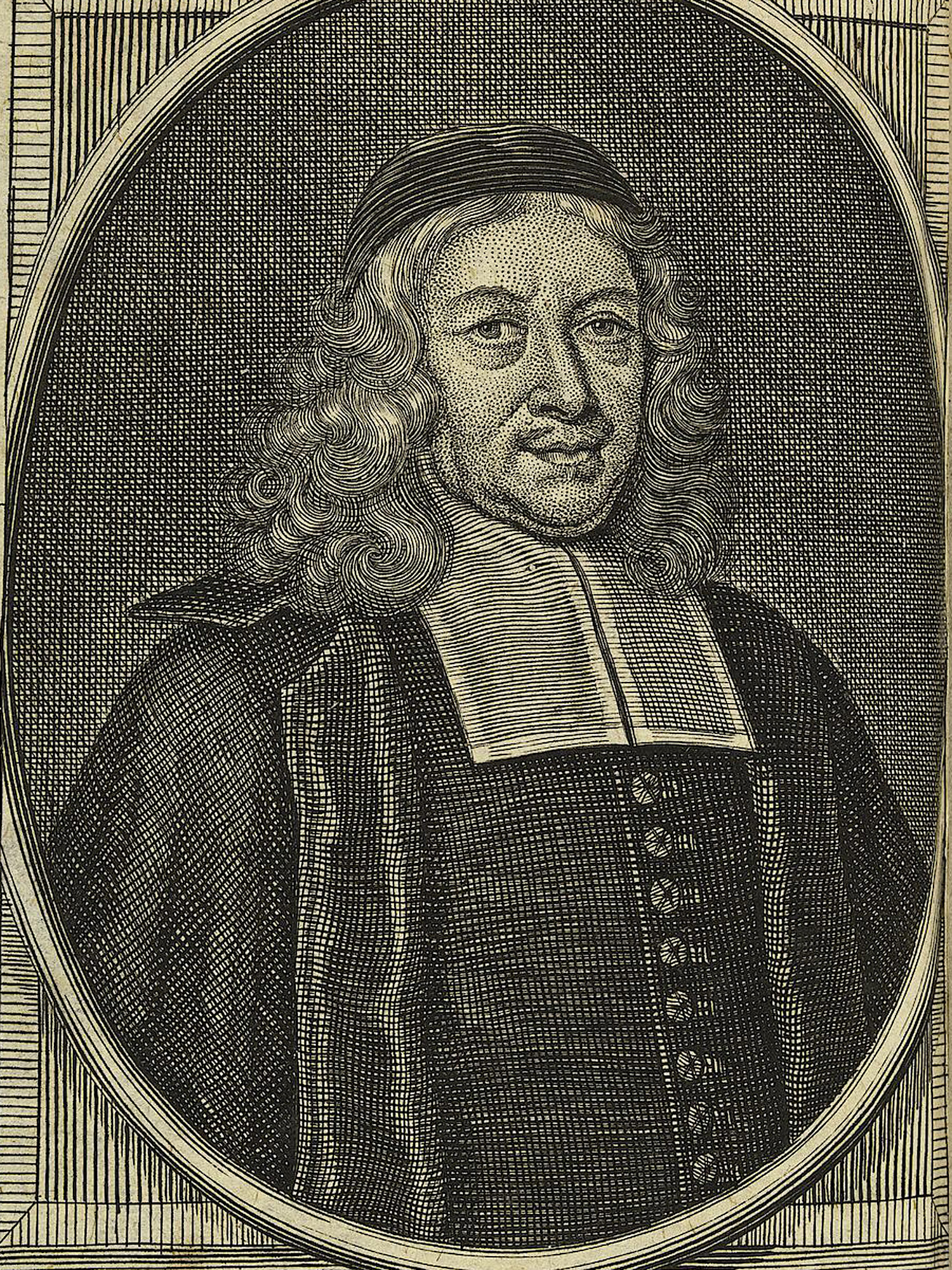 Porträt von Loescher, Caspar  (Die Gelehrte Fama, welche den gegenwärtigen Zustand der gelehrten Welt und sonderlich derer deutschen Universitäten entdecket., 1711, 10. T., ungez. Bl. am Anf. d. Stückes. [Zuschnitt auf Schmuckrahmen])