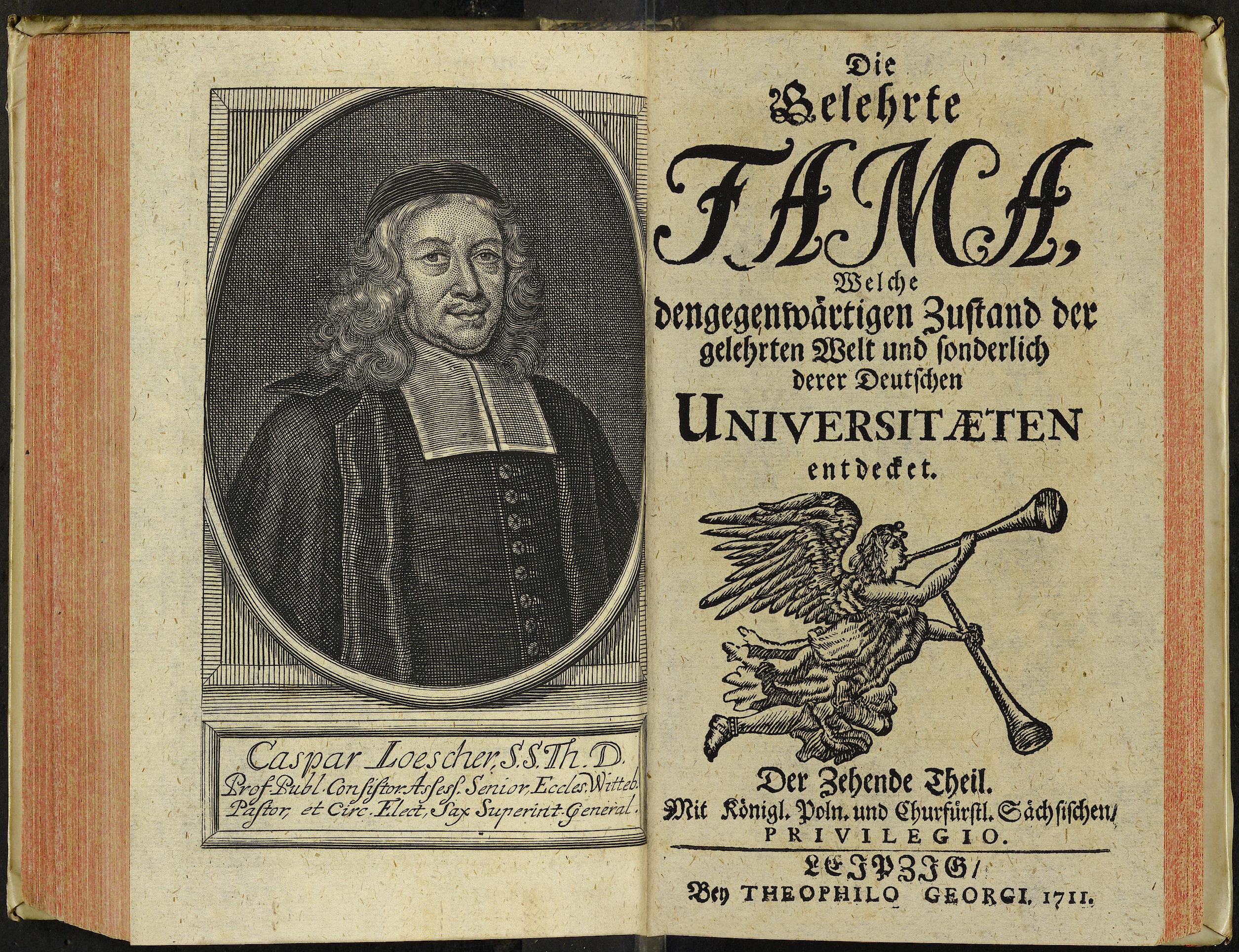 Porträt von Loescher, Caspar  (Die Gelehrte Fama, welche den gegenwärtigen Zustand der gelehrten Welt und sonderlich derer deutschen Universitäten entdecket., 1711, 10. T., ungez. Bl. am Anf. d. Stückes. [Doppelseite])