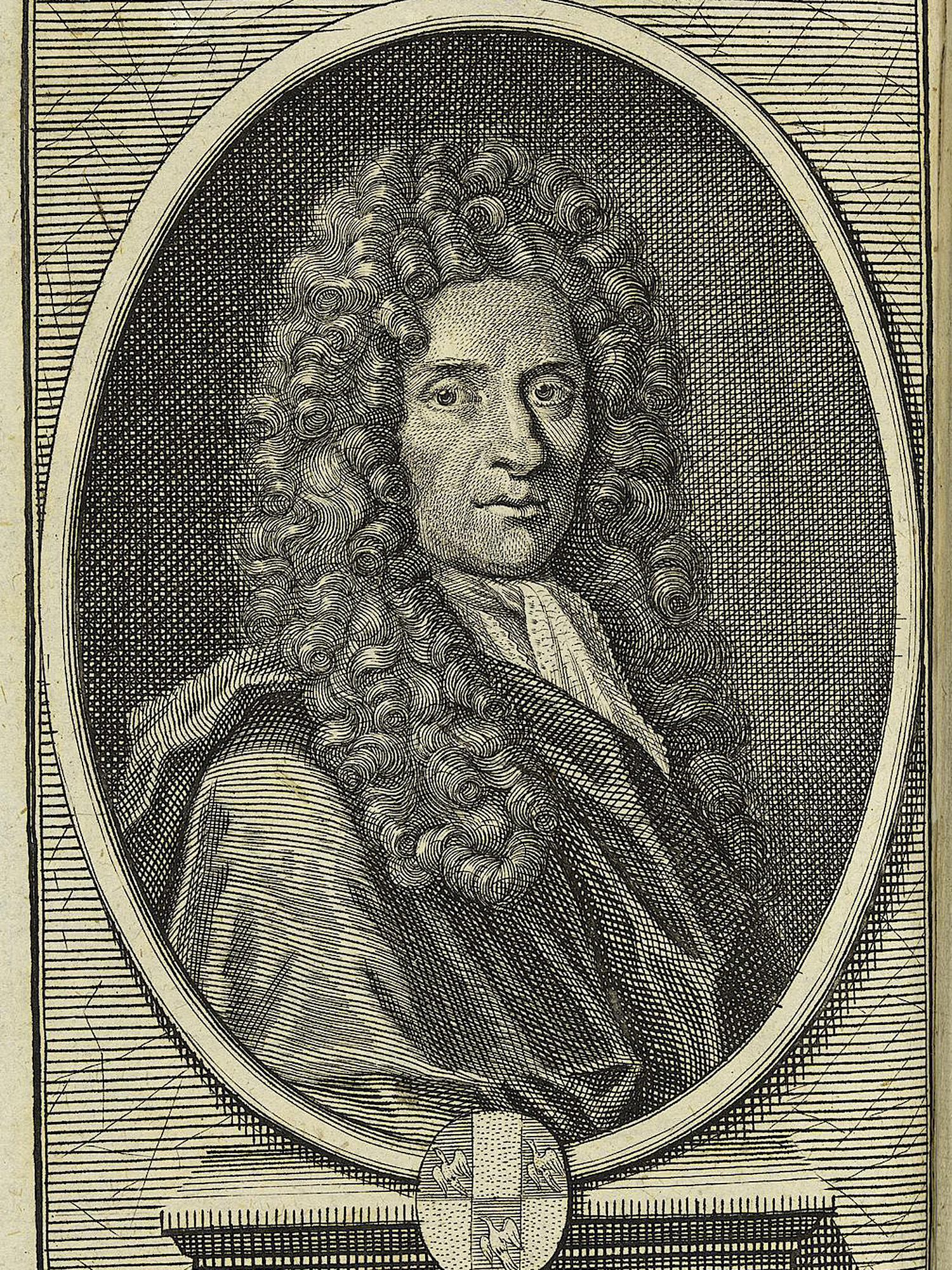 Porträt von Locke, John  (Die Gelehrte Fama, welche den gegenwärtigen Zustand der gelehrten Welt und sonderlich derer deutschen Universitäten entdecket., 1711, 4. T., ungez. Bl. am Anf. d. Stückes. [Zuschnitt auf Schmuckrahmen])