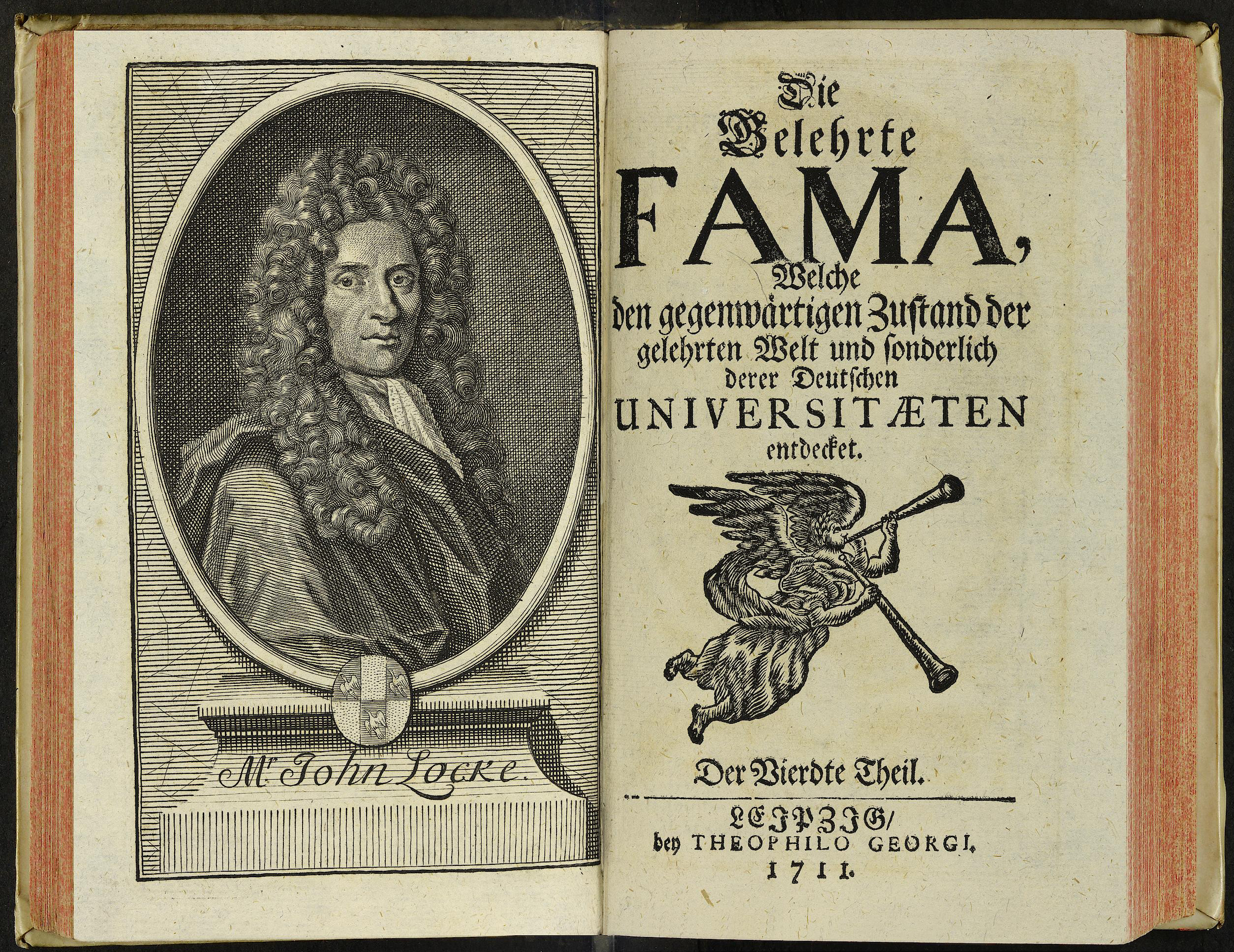 Porträt von Locke, John  (Die Gelehrte Fama, welche den gegenwärtigen Zustand der gelehrten Welt und sonderlich derer deutschen Universitäten entdecket., 1711, 4. T., ungez. Bl. am Anf. d. Stückes. [Doppelseite])