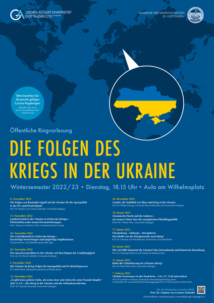 Die Ringvorlesung der Universität Göttingen und der Niedersächsischen Akademie der Wissenschaften zu Göttingen hat sich im Wintersemester 2022/23 mit den Folgen des Kriegs in der Ukraine beschäftigt. Dabei ging es unter anderem um die Agrarproduktion, den Handel und die Ernährungssicherheit - aber auch um die ukrainischen Sprache, die innenpolitische Entwicklung der Ukraine, die Rolle der orthodoxen Kirchen oder die Flüchtlingssituation. Mitschnitte der Vortragsreihe finden Sie hier