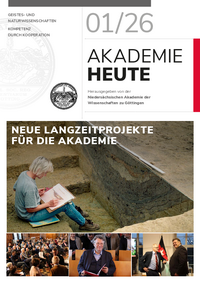 With our magazine Akademie heute, we regularly address the public, our members in Germany and abroad, our staff, and anyone interested in the activities of the Göttingen Academy of Sciences and Humanities in Lower Saxony. We report on events, conduct interviews on current topics, and share findings and updates from our research projects. You can download the current issue here and older issues, dating back to 2007, here.