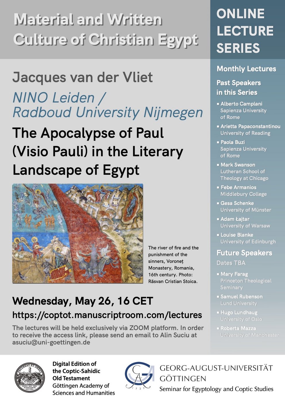 Jacques van der Vliet (NINO Leiden/Radboud University Nijmegen) will present his paper "The Apocalypse of Paul (Visio Pauli) in the Literary Landscape of Egypt."
